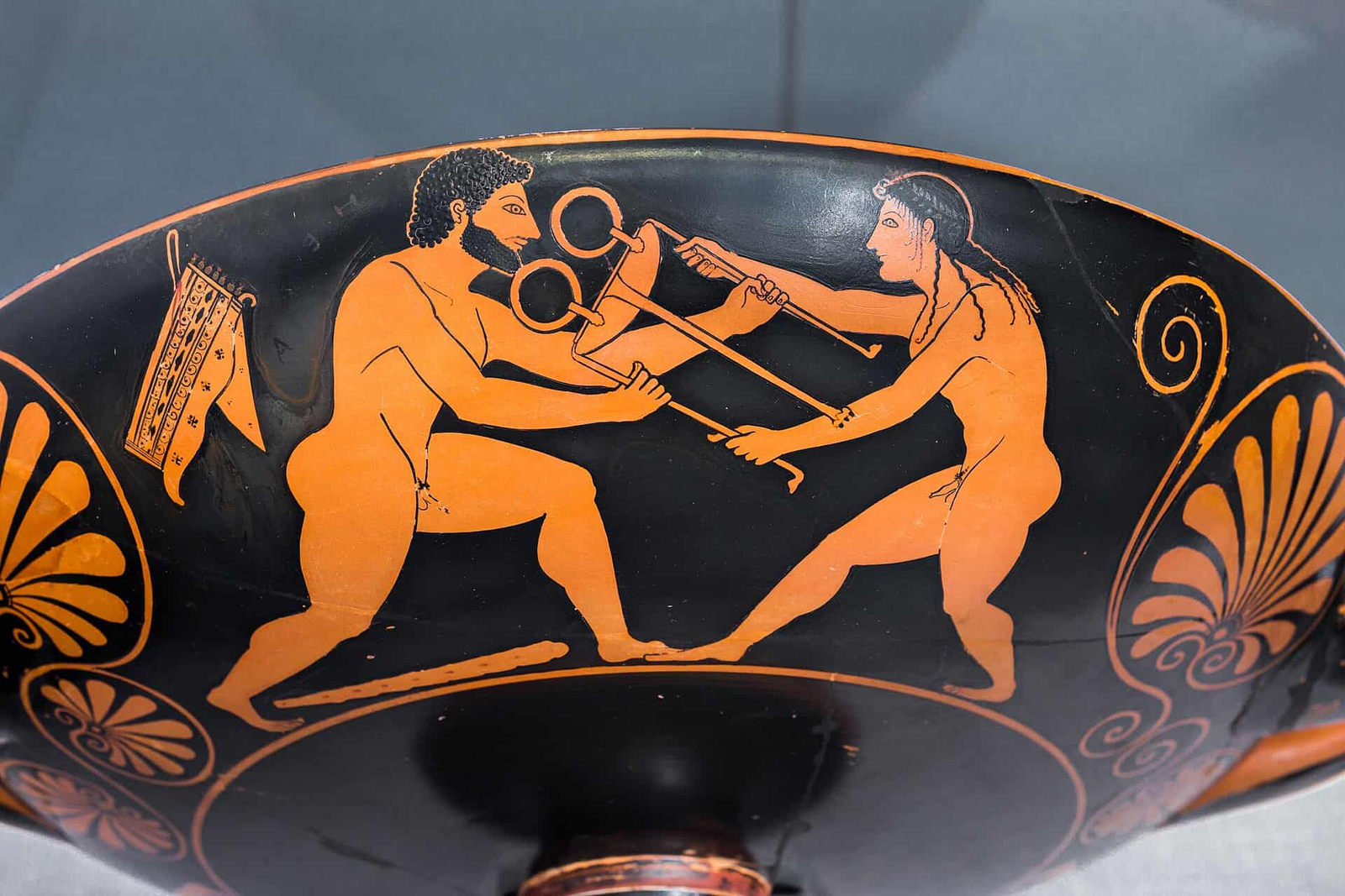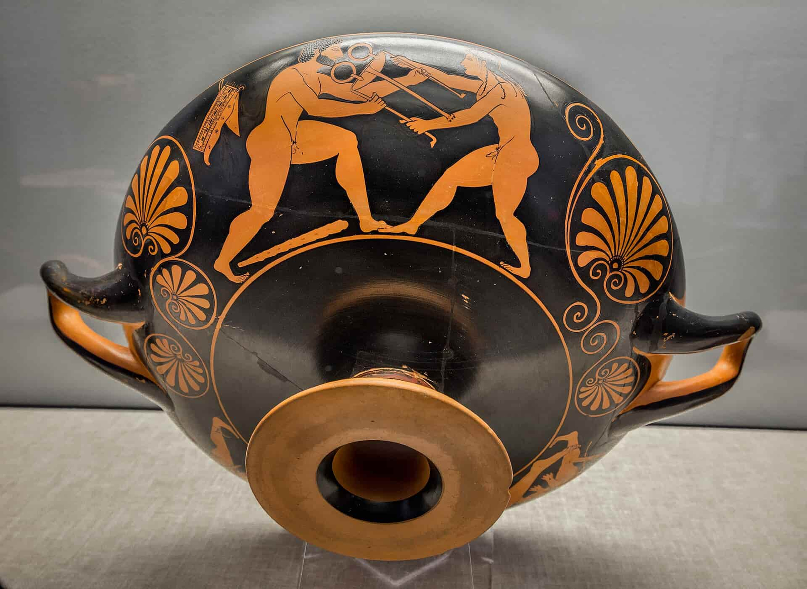La decoración circundante con motivos florales refuerza el carácter ornamental de la pieza, destinada seguramente a un simposio, donde los participantes podían beber vino mientras contemplaban imágenes relacionadas con el deporte, la mitología o la vida aristocrática.