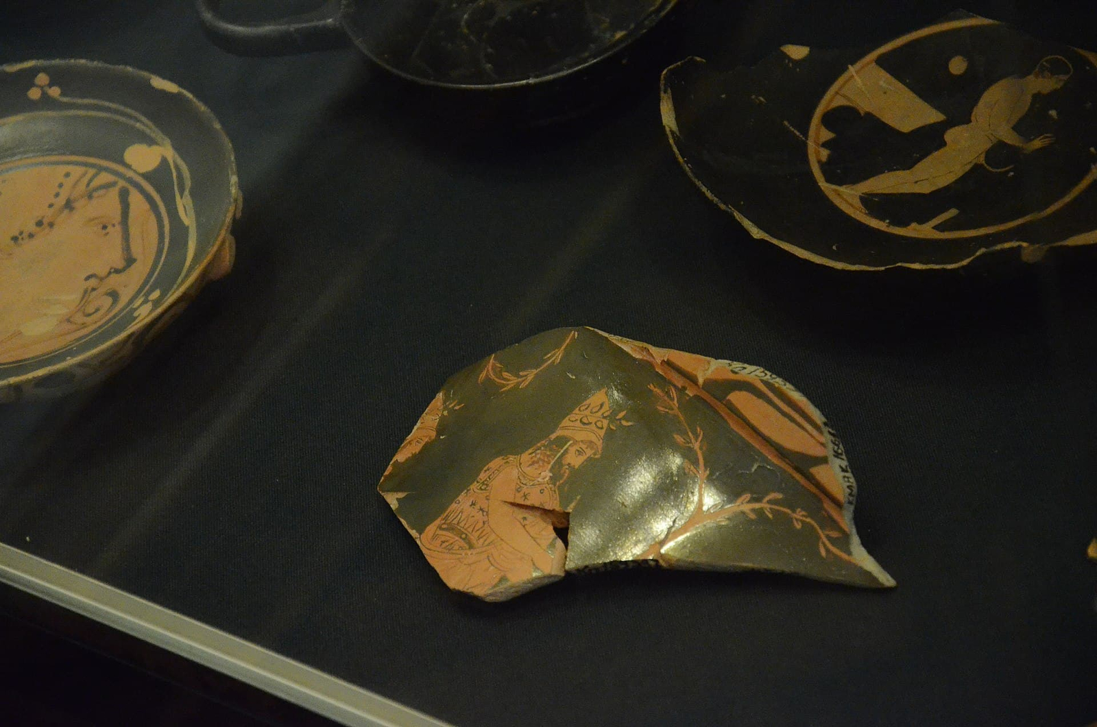 Fragmento de cerámica de figuras rojas con la representación de una figura femenina ricamente ataviada, posiblemente una diosa o sacerdotisa, enmarcada por motivos vegetales. Museo Histórico y Arqueológico de Kerch, Crimea. Foto: Andrew Butko. CC BY-SA 3.0. Original file (4,928 × 3,264 pixels, file size: 8.58 MB).