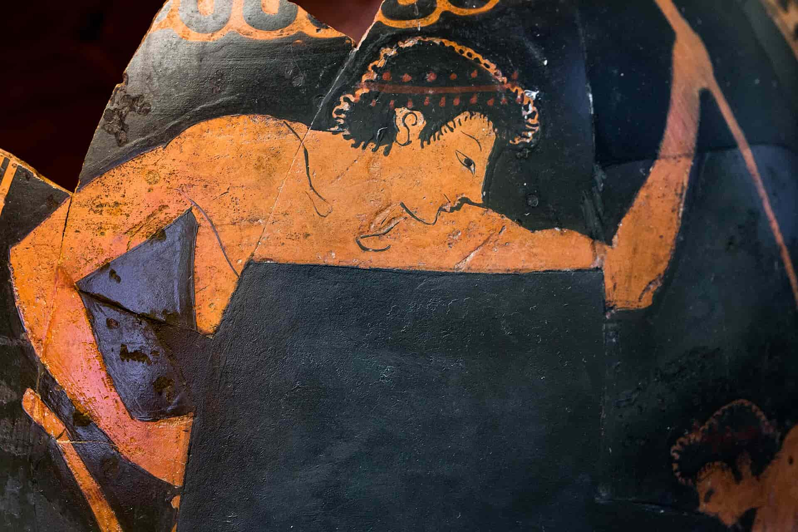 Fragmento de vaso ático de figuras rojas atribuido a Euphronios. Detalle de un guerrero en combate. Ca. 510 a. C., procedente de Etruria. Foto: ArchaiOptix. CC BY-SA 4.0. Original file (5,472 × 3,648 pixels, file size: 15.52 MB).