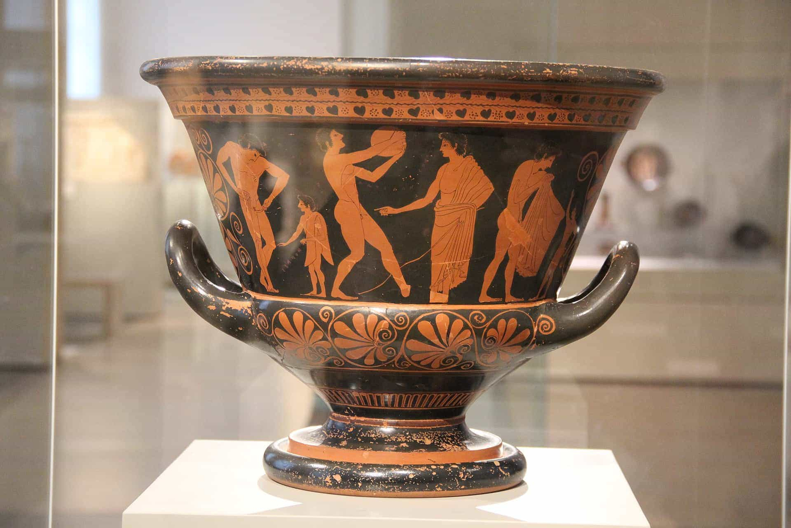 La escena representada en esta crátera nos traslada al universo cotidiano de la palestra, el lugar donde los jóvenes griegos se entrenaban física y moralmente. A diferencia de las cráteras con escenas míticas, aquí no aparece ningún héroe ni dios, sino hombres anónimos, ciudadanos en formación. La imagen es por tanto un documento visual sobre la vida diaria en la Atenas de comienzos del siglo V a. C.