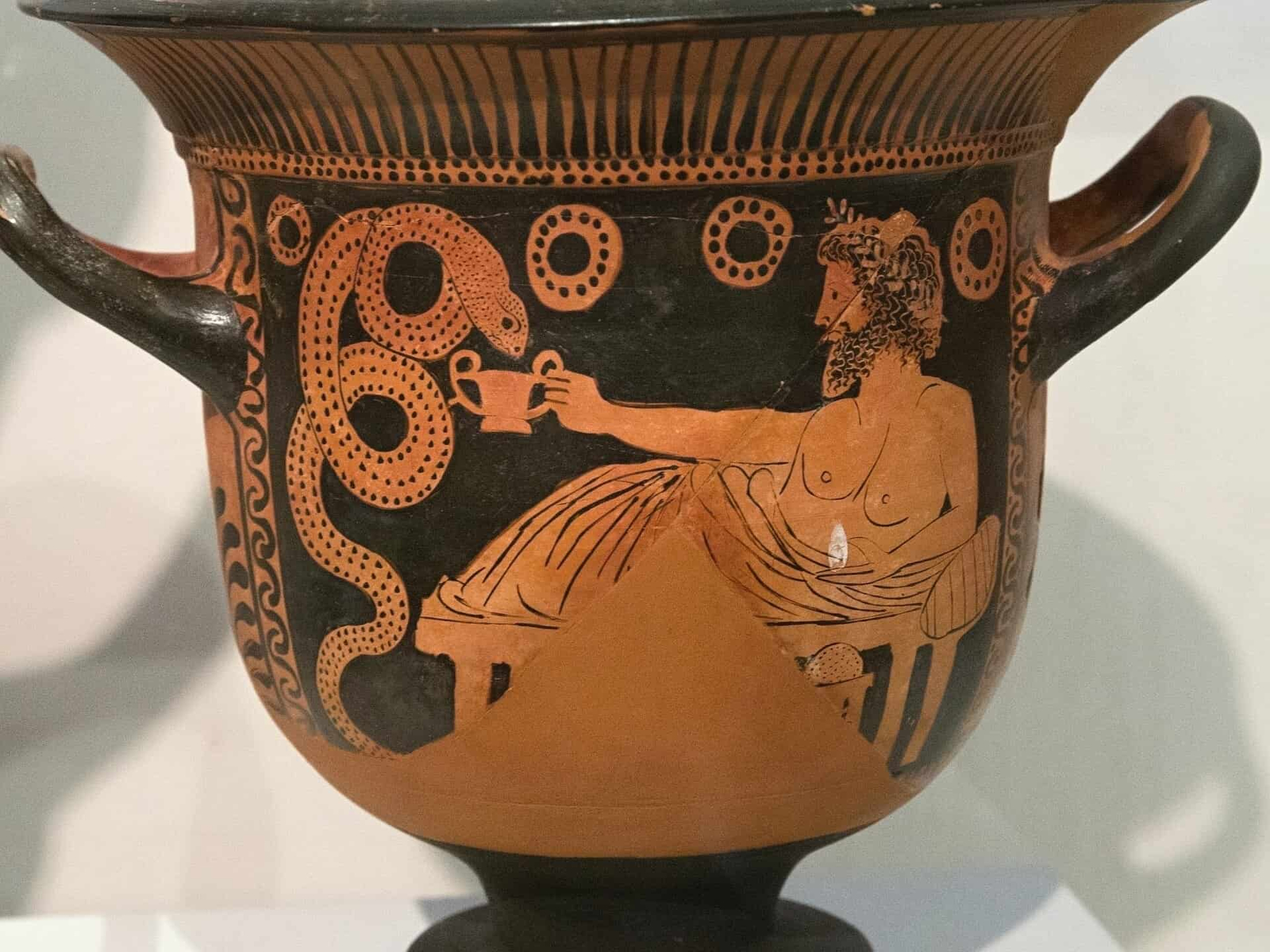Crátera de campana de figuras rojas. A. El dios Cabiros, en la forma de Dioniso Ctónio, representado reclinado, con un huevo en la mano izquierda y un cántaro (kántharos) del que bebe una serpiente en la derecha. Procedente de Beocia. Obra del Pintor de los Mystai, finales del siglo V a. C.Museo Arqueológico de Atenas, n.º1393. Foto:. Zde. CC BY-SA 4.0. Original file (4,207 × 3,155 pixels, file size: 7.65 MB). Crátera de campana de figuras rojas (finales del siglo V a. C.), obra del Pintor de los Mystai.