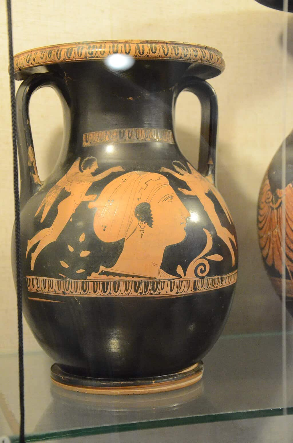 Ánfora de figuras rojas con la representación de un busto femenino de perfil acompañado de figuras aladas, posiblemente Eros o Niké, en actitud de ofrenda, que sugieren un mensaje simbólico de amor, belleza y triunfo. La escena, delicadamente equilibrada, refleja el gusto de la cerámica griega tardoclásica por las composiciones elegantes y cargadas de significado, utilizadas tanto en banquetes como en contextos rituales y funerarios. Ejemplo de la elegancia de la cerámica ático de figuras rojas del siglo IV a. C. Museo Histórico y Arqueológico de Kerch, Crimea. Foto: Andrew Butko. CC BY-SA 3.0. Original file (3,264 × 4,928 pixels, file size: 9.94 MB).