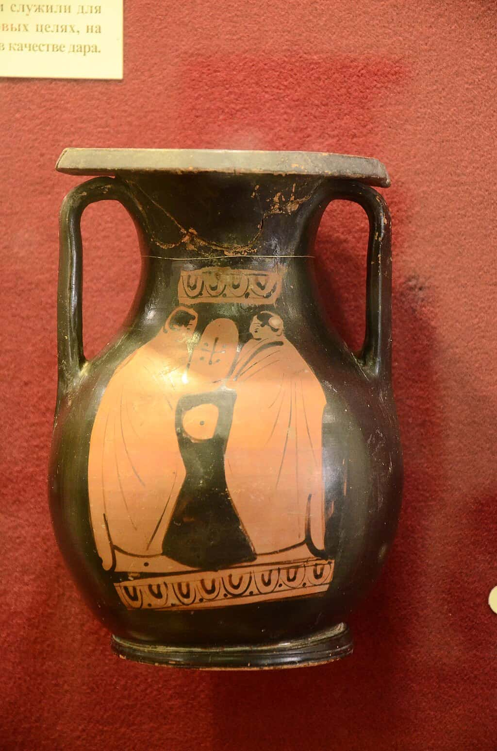 Ánfora de figuras rojas con escena de tres personajes, posiblemente en contexto ritual o funerario, destacando la figura femenina central y los dos personajes envueltos en mantos. Museo Histórico de Eupatoria, Crimea. Foto: Andrew Butko. CC BY-SA 4.0. Original file(3,264 × 4,928 pixels, file size: 10.81 MB).