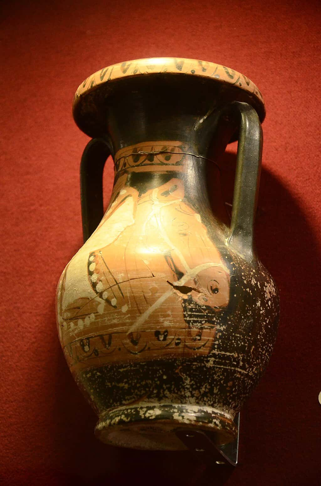La superficie cuenta la historia material de la pieza. Se ven craquelados y pérdidas de barniz, además de una fisura restaurada en la zona del hombro y una laguna en la panza; esas cicatrices son normales en cerámicas que han pasado siglos enterradas en suelos salinos y luego han sido consolidadas en laboratorio. El leve punteado claro que salpica la zona inferior no es pintura, sino depósitos y abrasiones del barniz producidos por el tiempo. El soporte metálico moderno visible en la base indica que la vasija ha sido estabilizada para su exposición.