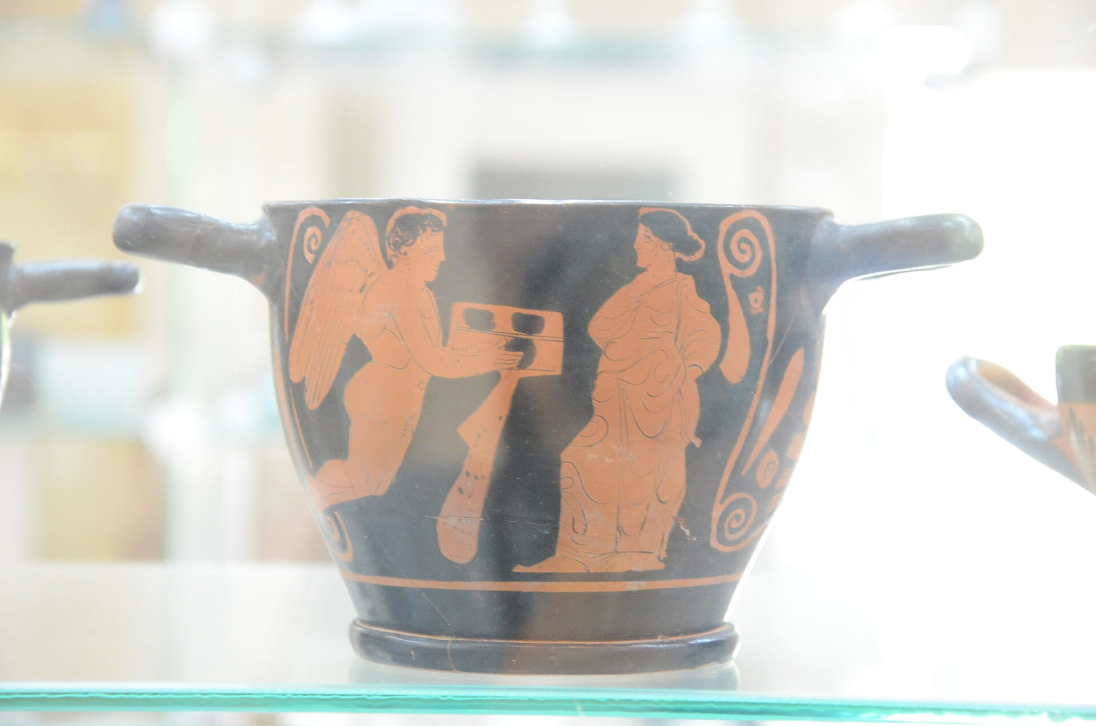 Skyphos de figuras rojas con Eros ofreciendo un cofrecillo a una mujer, posiblemente en una escena de carácter nupcial. Cerámica ático, siglo IV a. C. — Museo de la ciudad de Gorgippia. Foto: Andrew Butko. CC BY-SA 4.0. Original file (4,928 × 3,264 pixels, file size: 5.02 MB).