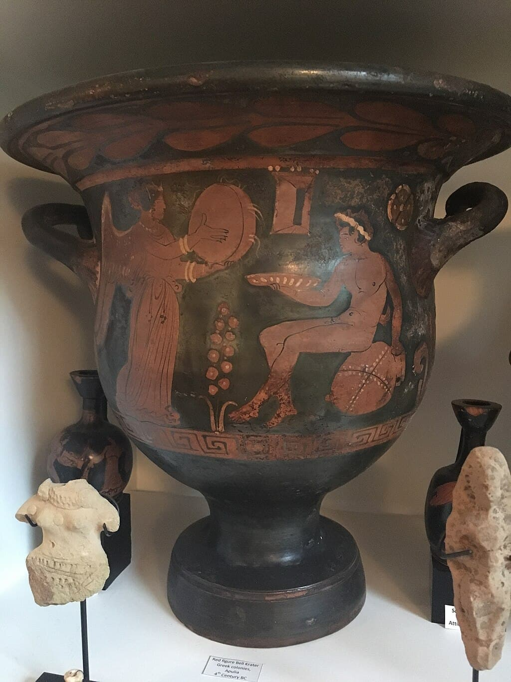 Esta es una crátera de campana apuliana de figuras rojas, fechada entre 350–370 a. C. y perteneciente a la Colección Eltringham. La escena es típicamente dionisíaca: a la izquierda aparece una ménade (seguidora de Dioniso) en actitud de danza, tocando un tímpano (tambor de marco utilizado en rituales báquicos), mientras que a la derecha vemos un sátiro desnudo, coronado de hiedra, sentado de forma relajada sobre una ánfora de vino. La composición es dinámica y evoca el ambiente de éxtasis ritual característico de las fiestas dionisíacas, donde el vino, la música y la danza eran vehículos de comunión con lo divino. La escena es típicamente dionisíaca: a la izquierda aparece una ménade (seguidora de Dioniso) en actitud de danza, tocando un tímpano (tambor de marco utilizado en rituales báquicos), mientras que a la derecha vemos un sátiro desnudo, coronado de hiedra, sentado de forma relajada sobre una ánfora de vino. La composición es dinámica y evoca el ambiente de éxtasis ritual característico de las fiestas dionisíacas, donde el vino, la música y la danza eran vehículos de comunión con lo divino.