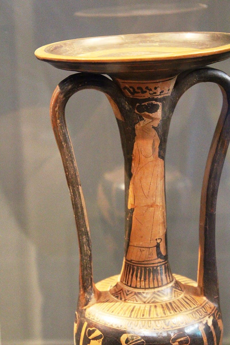 El lékythos nos introduce en la intimidad doméstica y funeraria: su forma esbelta y su uso para aceites perfumados lo vinculan con rituales cotidianos y con el cuidado de los difuntos. La escena de mujeres conversando aporta un testimonio silencioso de la vida del gineceo.