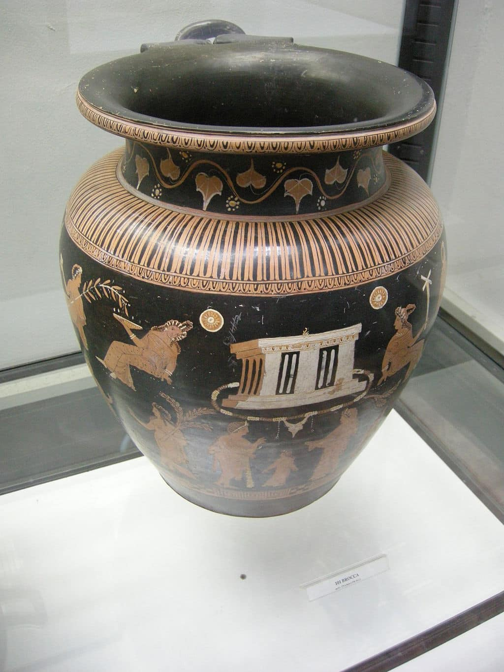 La decoración de esta hidria apulia muestra un naiskos (pequeño templo o santuario) en el centro de la composición, flanqueado por figuras humanas que parecen estar en procesión u ofreciendo ritos. Los detalles incluyen coronas, ramas y objetos rituales, lo que sugiere un contexto funerario o heroico.