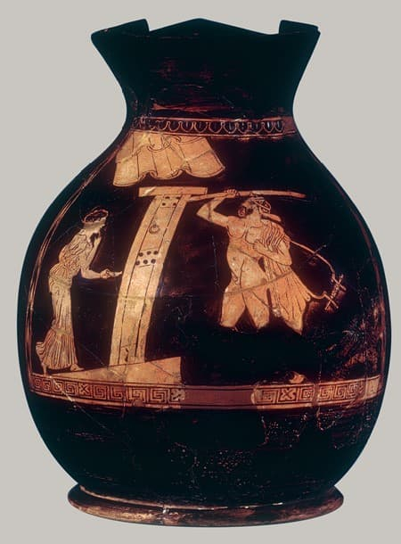 El chous era un tipo de jarra pequeña, utilizada para el vino, muy característico de las fiestas de las Anthesterias, festivales atenienses dedicados a Dioniso. Las escenas de Heracles en este contexto refuerzan el ideal heroico y el vínculo entre el héroe, el vino y la celebración.