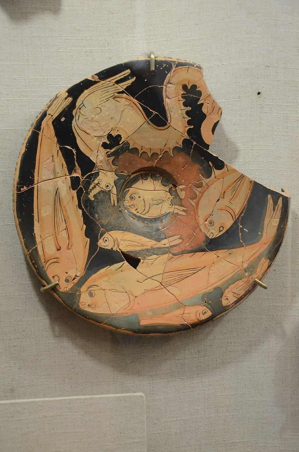 El plato está decorado con diversos peces dispuestos en círculo alrededor del fondo, en este caso muy bien reconocibles por sus cuerpos alargados y cabezas detalladas. Este tipo de piezas es fascinante porque combina arte y gastronomía: se utilizaban en banquetes para servir pescado, uno de los alimentos de lujo en el mundo griego. La disposición de los peces no es casual, sino que aprovecha el espacio circular para crear una composición armónica que acompaña el uso del plato.