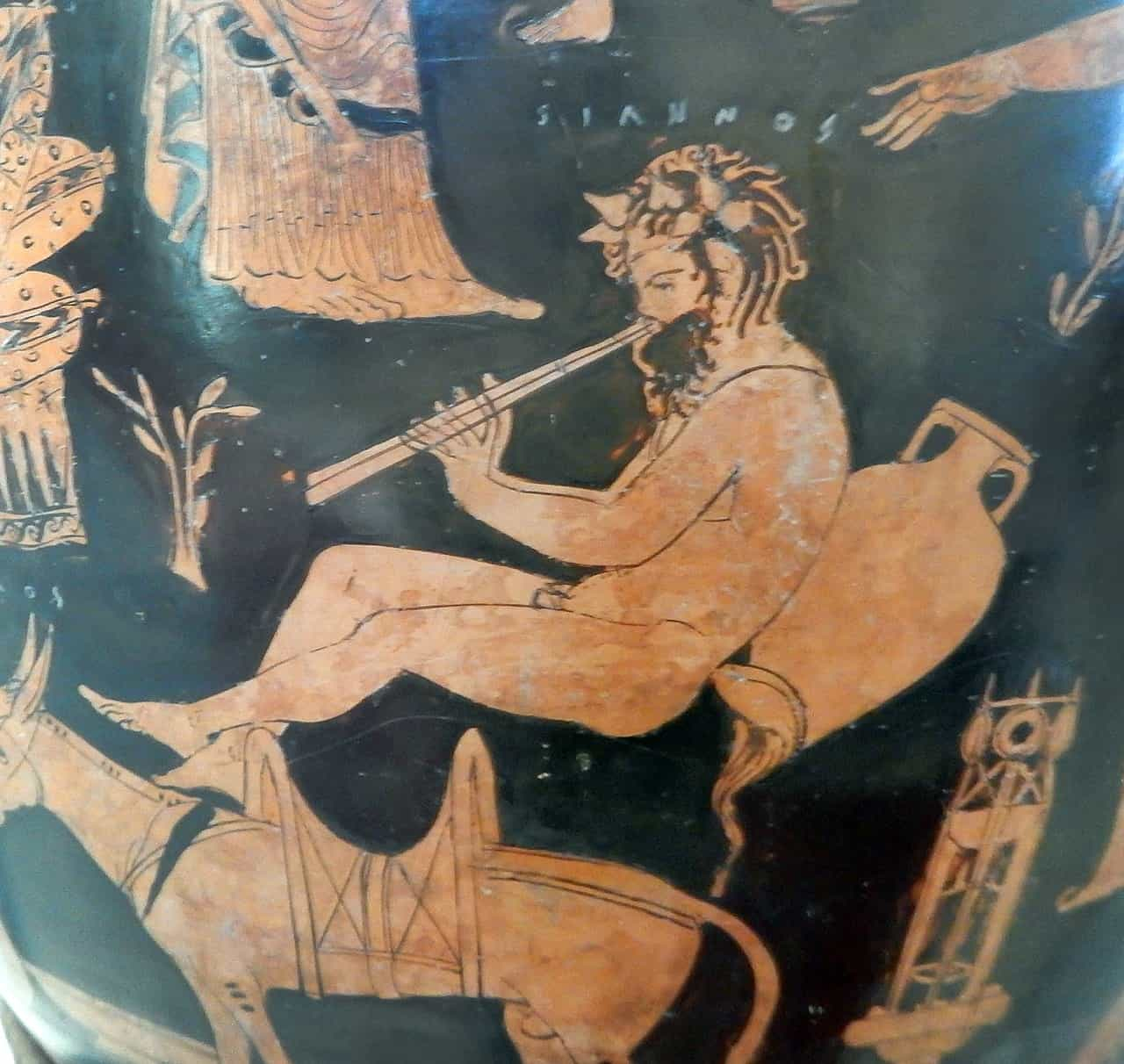 La figura que aparece en el centro de la imagen es Sileno, el anciano sátiro y mentor de Dioniso, representado desnudo y sentado, tocando la aulos (flauta doble). A su alrededor se aprecian otros elementos relacionados con el mundo dionisíaco, como el vino (ánfora) y un ambiente festivo.
