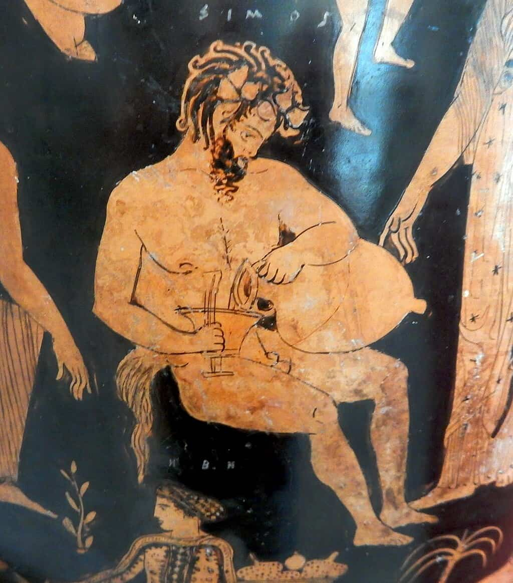 La imagen muestra al sátiro Simos, sentado y sosteniendo un gran odre de vino mientras llena su copa. La inscripción con su nombre sobre la figura es un detalle excepcional, ya que los sátiros no siempre se identifican de forma individual.