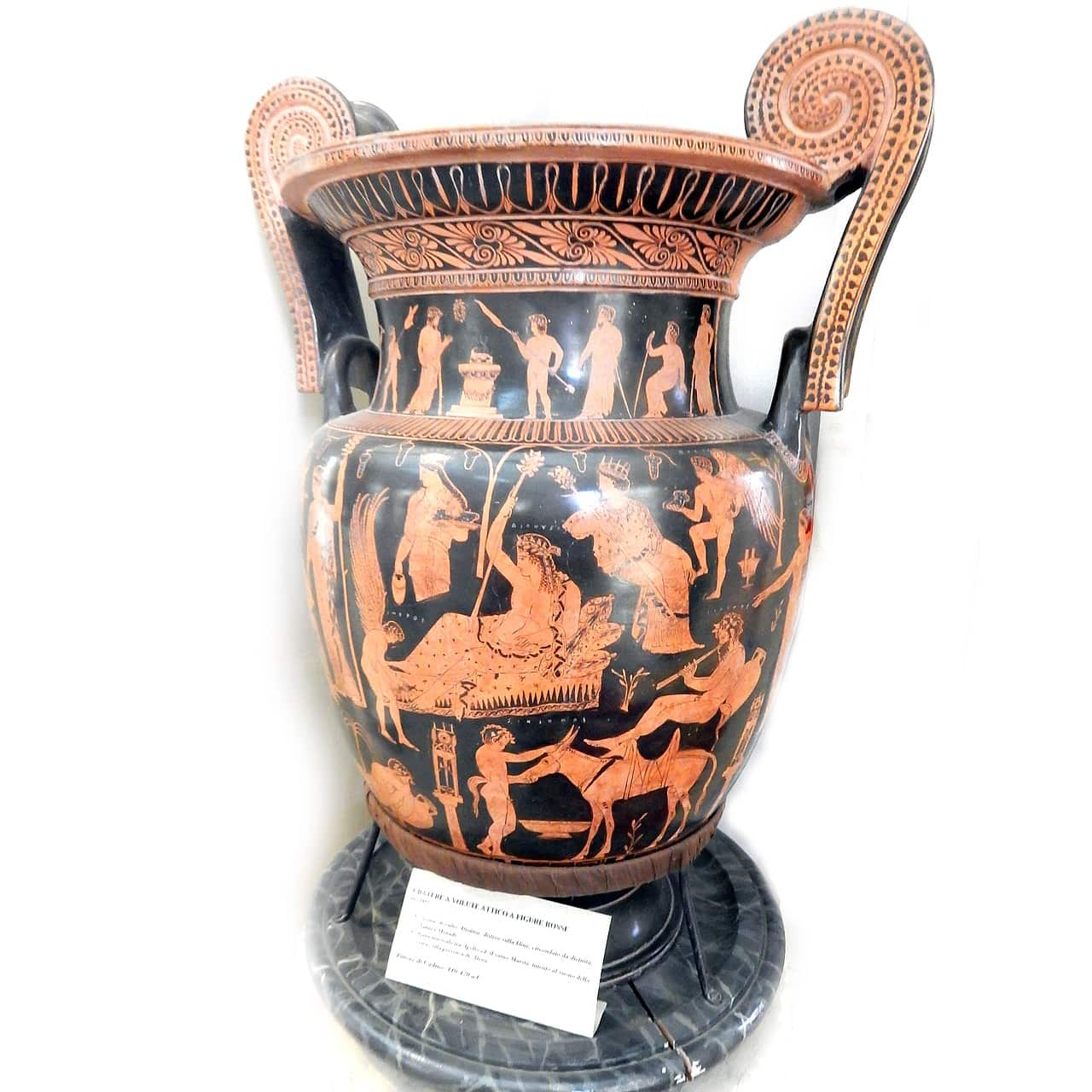 La decoración superior muestra una procesión de personajes, posiblemente alusiva a un rito o celebración. En conjunto, la pieza transforma la crátera en un auténtico manifiesto visual del culto a Dioniso: banquete, música, danza y vino se conjugan para evocar la experiencia extática del simposio y del ritual mistérico.