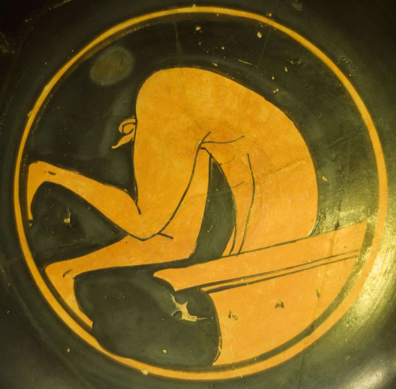 Kylix de figuras rojas (ca. 490–480 a. C.) — Sileno ebrio dentro de una tinaja de vino. Procedencia: Ática. Detalle. Copa ática del pintor de Euergides en la que se muestra un hombre metido en la tinaja del vino. 510-500 a. C. Foto: Rowanwindwhistler. CC BY-SA 4.0. Original file (2,813 × 2,766 pixels, file size: 2.33 MB).