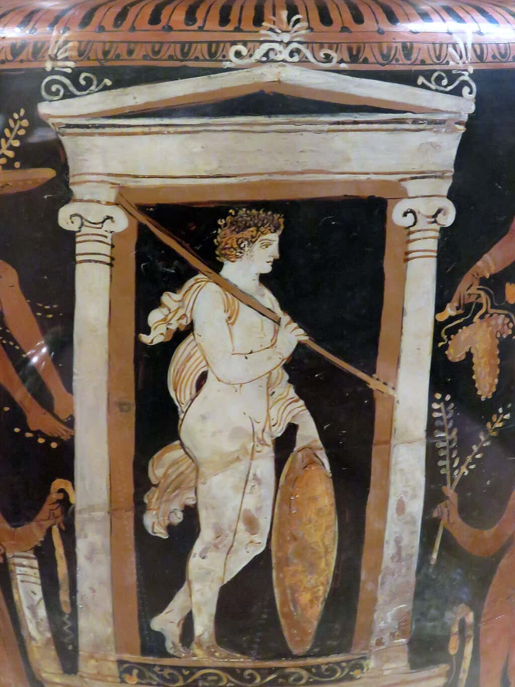 Detalle de la crátera de volutas apulia atribuida al Pintor de Gioia del Colle. Monte Sannace, Tumba 3-1957. Museo Arqueológico Nacional de Gioia del Colle (inv. BA 20054). Alexandra Attia. CC BY-SA 4.0. Original file (3,456 × 4,608 pixels, file size: 3.68 MB). La escena muestra a un joven héroe, desnudo, portando lanza y escudo, enmarcado dentro de un naiskos, símbolo de su estatus heroico y su conmemoración funeraria.