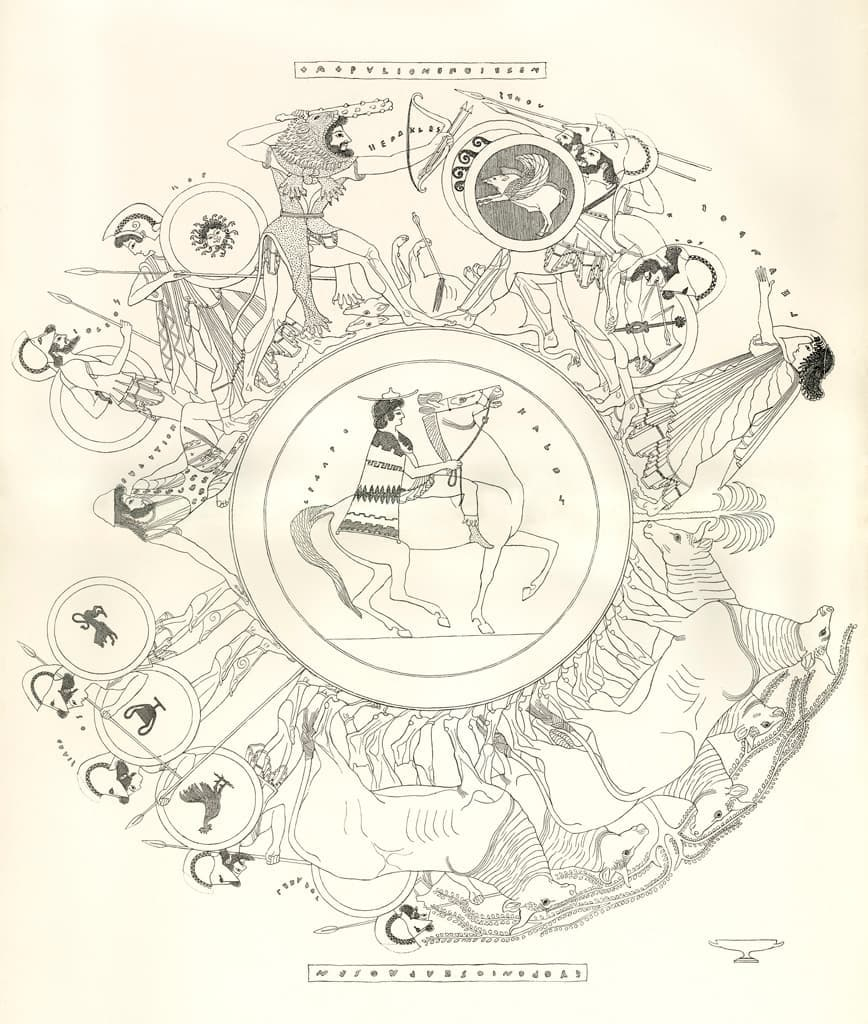 Esta ilustración corresponde a otro de los dibujos de Dugald Sutherland MacColl (1894), realizado a partir de una copa ática de figuras rojas atribuida a Euphronios, uno de los más célebres ceramógrafos y pintores áticos.