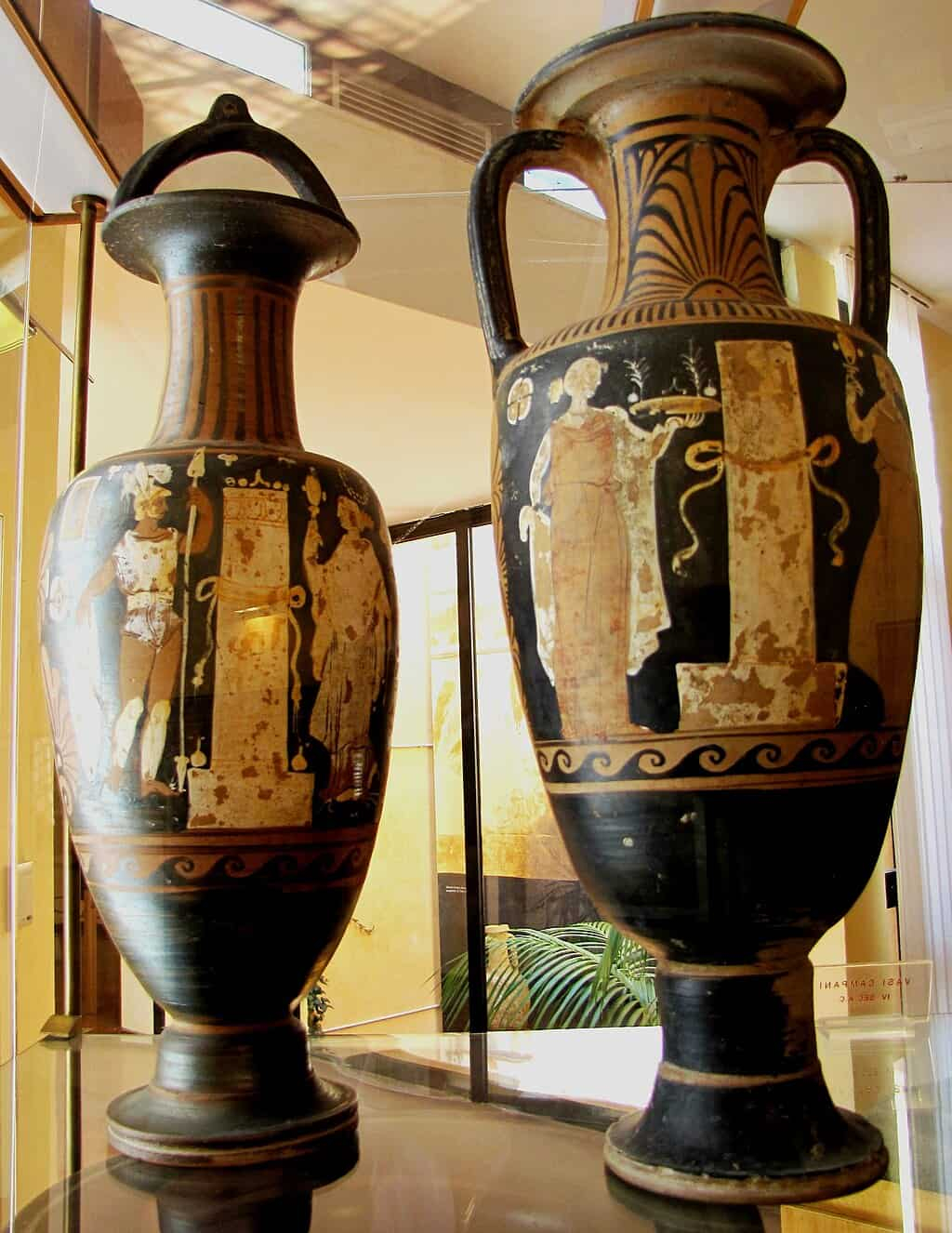 Lekythoi funerarios con escenas de ofrendas en la tumba — Museo Arqueológico de Agrigento. Foto: Hein56didden. CC BY-SA 4.0. Original file(2,365 × 3,062 pixels, file size: 1.19 MB).