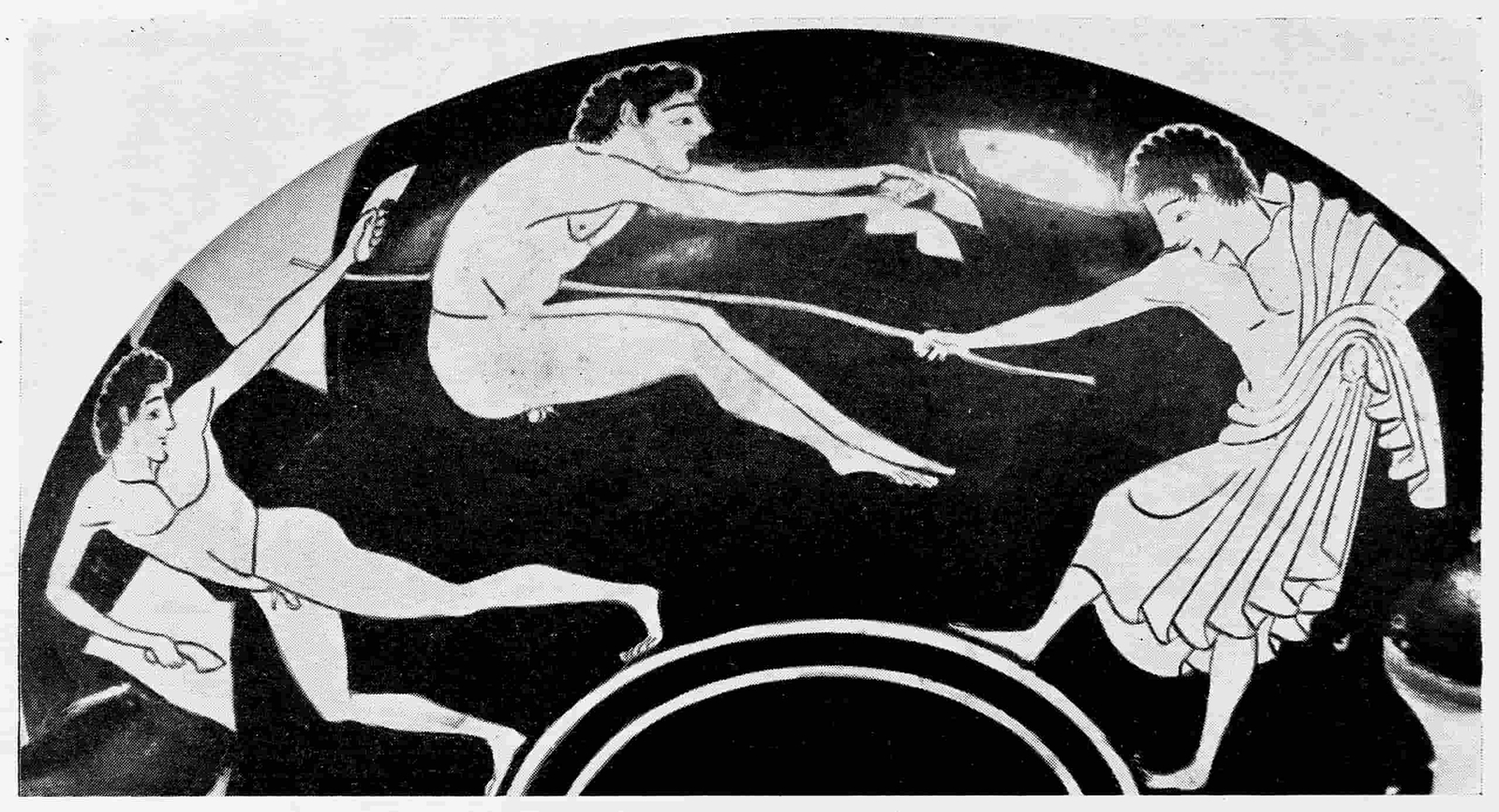 El saltador central lleva en las manos unas pesas llamadas halteres, que se utilizaban en la Antigüedad para ganar impulso y equilibrio en el salto.
