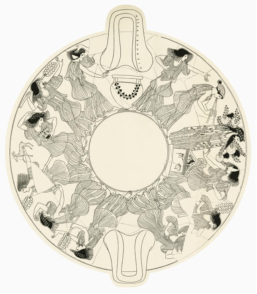 Dibujo a partir de una kylix ático de figuras rojas atribuida a Makron (pintor) y Hieron (alfarero). Procedencia: Vulci. Colección Antikensammlung, Berlín (F 2294). — Fuente: Wikimedia Commons, Dominio público.