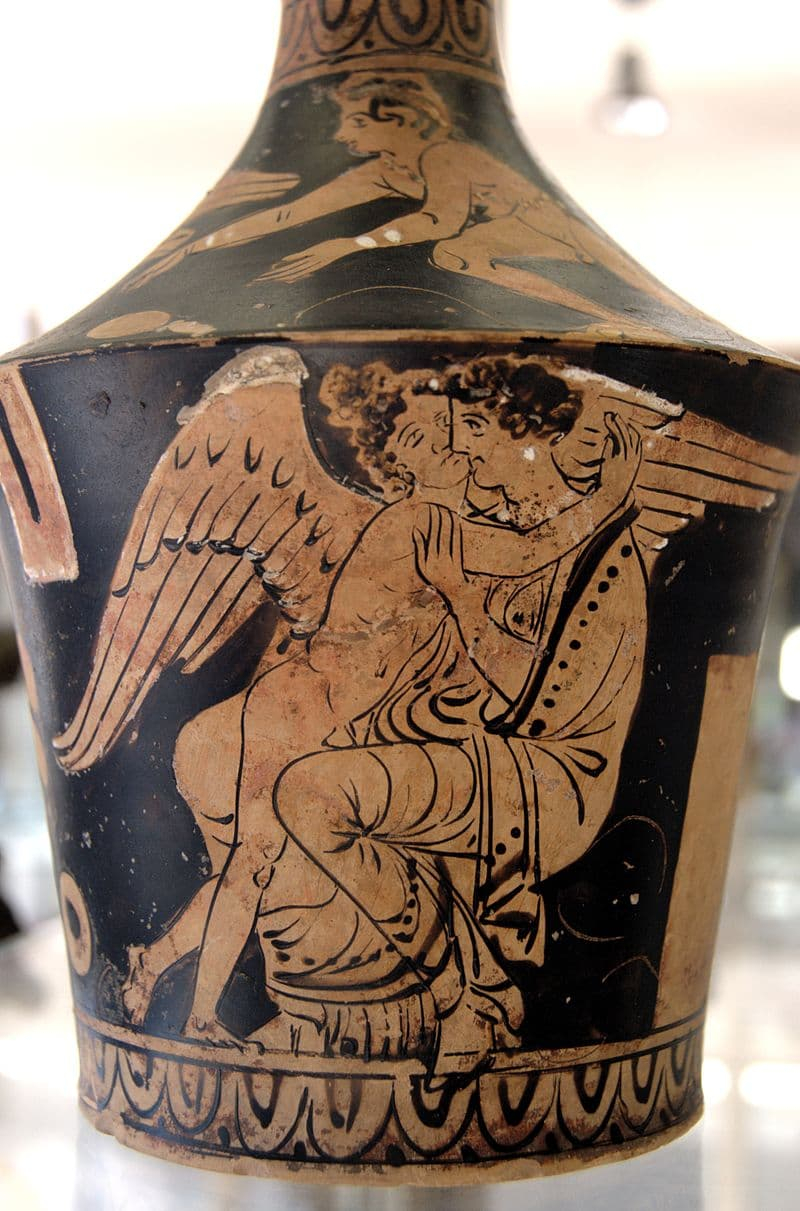 Eros y una mujer en abrazo amoroso. Oinochoe de figuras rojas procedente de la Magna Grecia, ca. siglo IV a. C. Colección del Cabinet des Médailles, París. — Fuente: Wikimedia Commons, Dominio público. a escena representada en este vaso muestra al dios Eros (con alas) abrazando y besando a una mujer mortal. Este tipo de imágenes eran comunes en la cerámica de figuras rojas del sur de Italia (Magna Grecia), especialmente en contextos funerarios, donde Eros simbolizaba tanto el amor y la atracción erótica como la fuerza vital y el renacimiento en el más allá. User:Bibi Saint-Pol. Original file (1,968 × 2,980 pixels, file size: 3.08 MB).