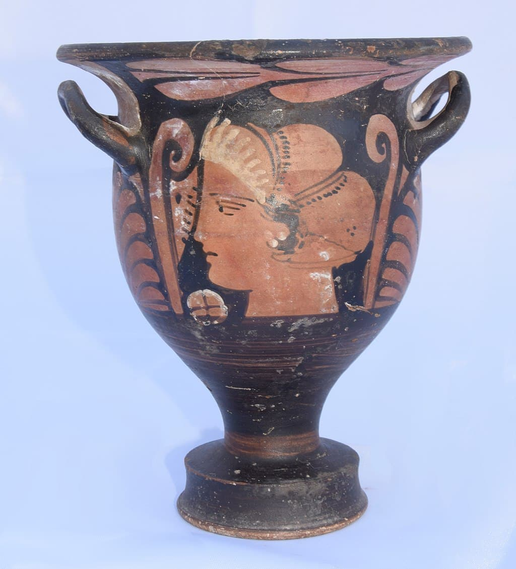 Cabeza femenina idealizada. Crátera de campana de figuras rojas, Magna Grecia, ca. siglo IV a. C. El retrato femenino, posiblemente de Afrodita o una ninfa, simboliza la belleza, la fertilidad y la esperanza de renacimiento en el más allá. — Fuente: Wikimedia Commons, Dominio público.La mujer retratada en este vaso de figuras rojas pertenece al tipo iconográfico común en la cerámica de la Magna Grecia (siglos IV–III a. C.), donde aparecen cabezas femeninas de perfil decorando vasos destinados al ámbito doméstico o funerario. Foto: Jarek Tuszyński. CC BY 4.0. Original file (3,886 × 4,212 pixels, file size: 5.04 MB).
