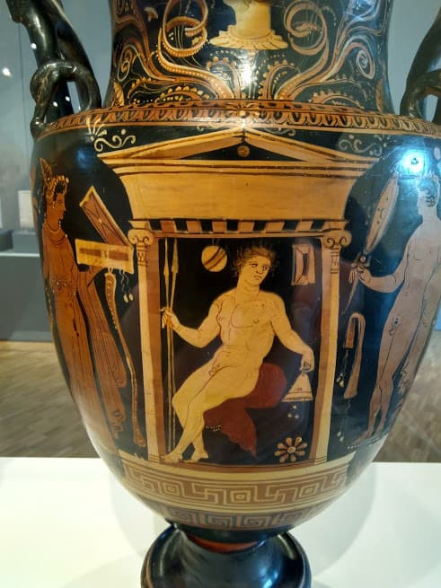 👉 En resumen: este vaso no muestra una escena mítica, sino una escena funeraria conmemorativa. El difunto se presenta como un “héroe” sentado en su morada eterna, bajo un templete jónico que simboliza la tumba.