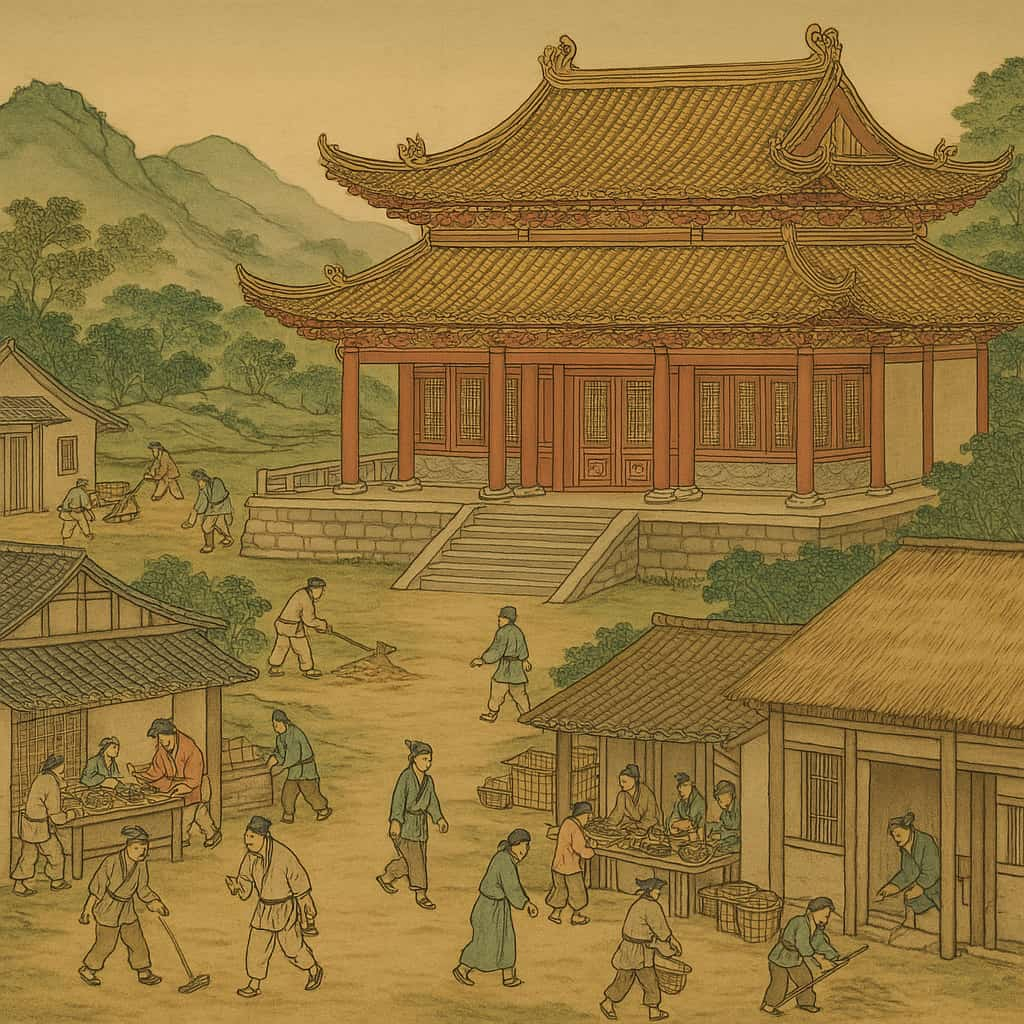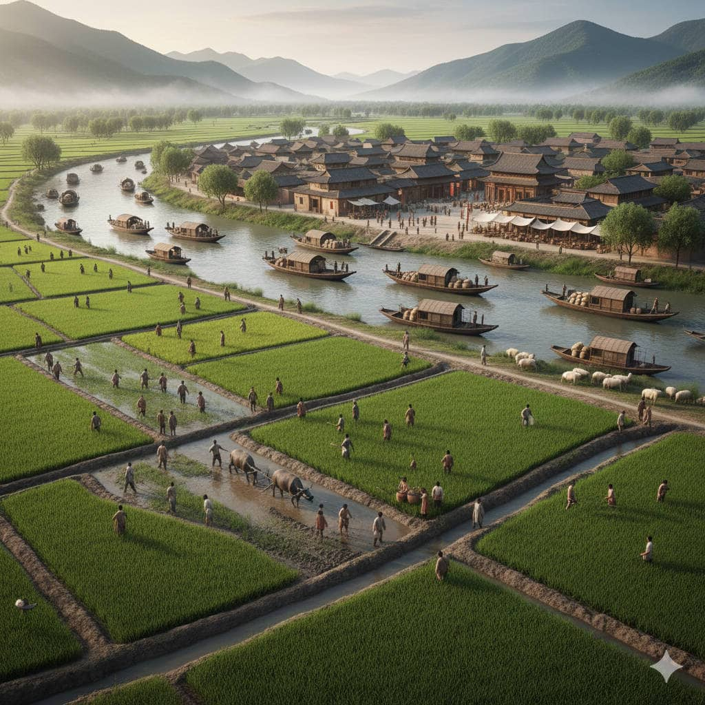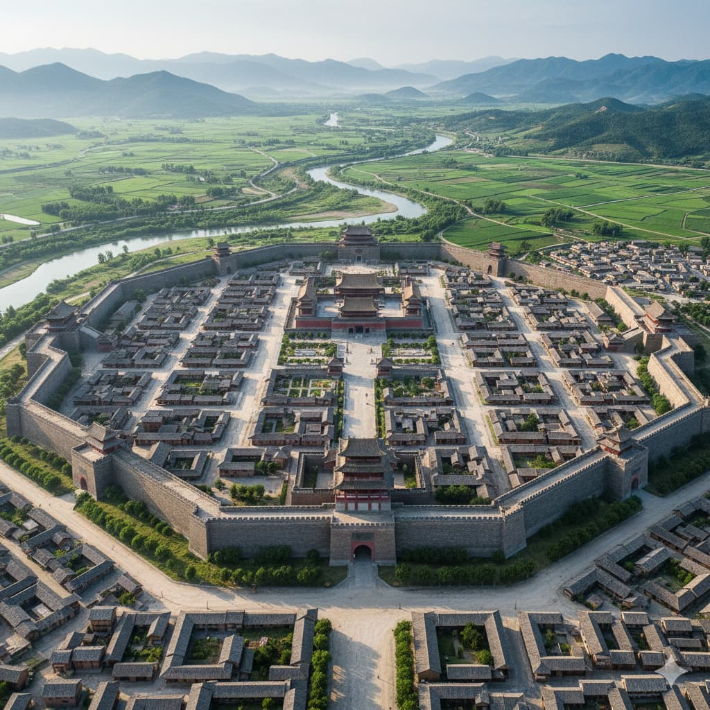 La ciudad representada en la imagen refleja ese ideal. Su trazado ordenado, su integración con el paisaje agrícola y su centralidad administrativa evocan una visión del Estado como garante del equilibrio entre sociedad y naturaleza. Este modelo, formulado en época Zhou, será asumido y perfeccionado por las dinastías imperiales posteriores, desde los Han hasta los Qing.