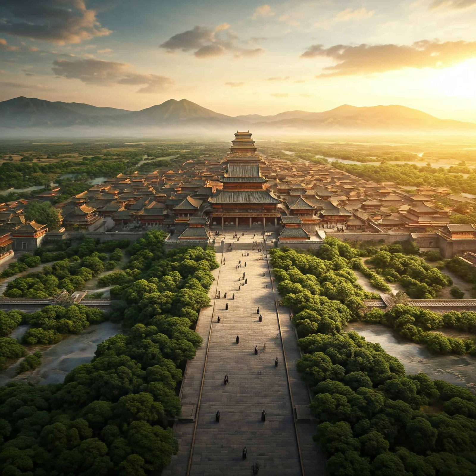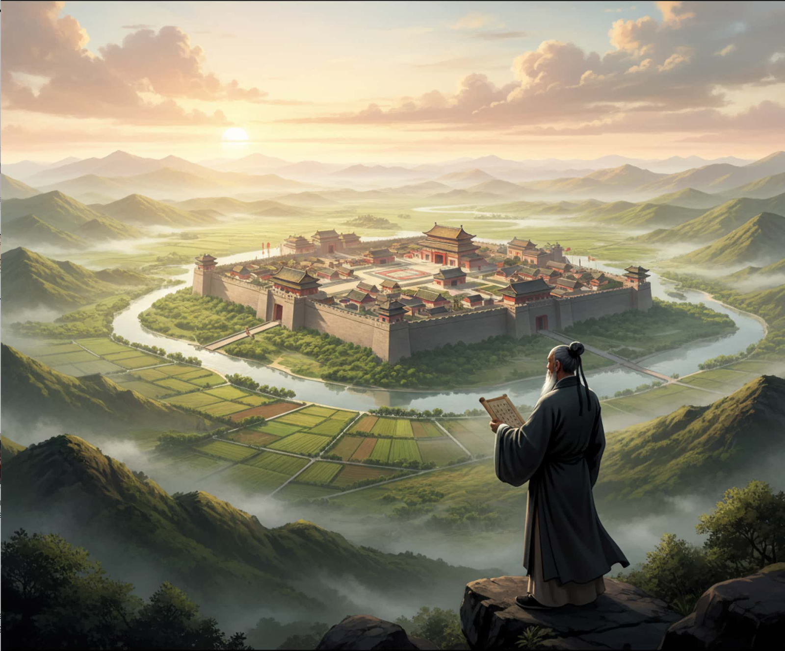 La imagen funciona como una poderosa síntesis visual del legado histórico de la dinastía Zhou. No representa un episodio concreto, sino una idea de larga duración: la construcción de un orden político, moral y cultural destinado a perdurar más allá de una dinastía concreta. El sabio que observa desde la distancia simboliza la reflexión histórica, la transmisión del conocimiento y la conciencia de continuidad; la ciudad amurallada, perfectamente organizada, encarna el ideal de Estado heredado del mundo Zhou.