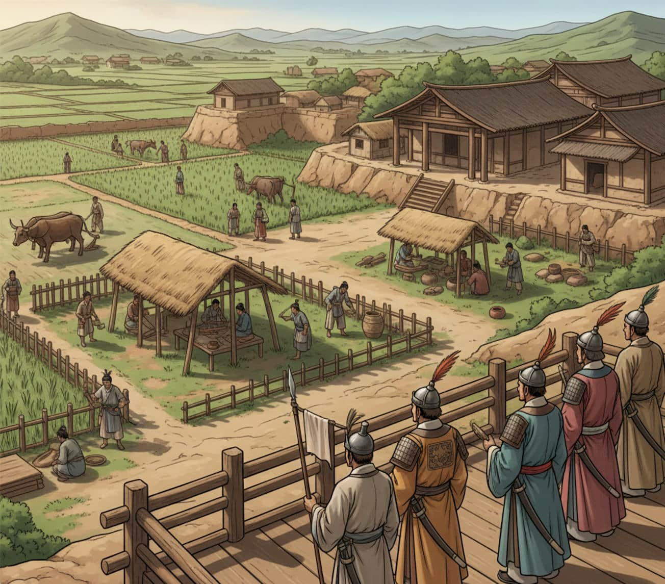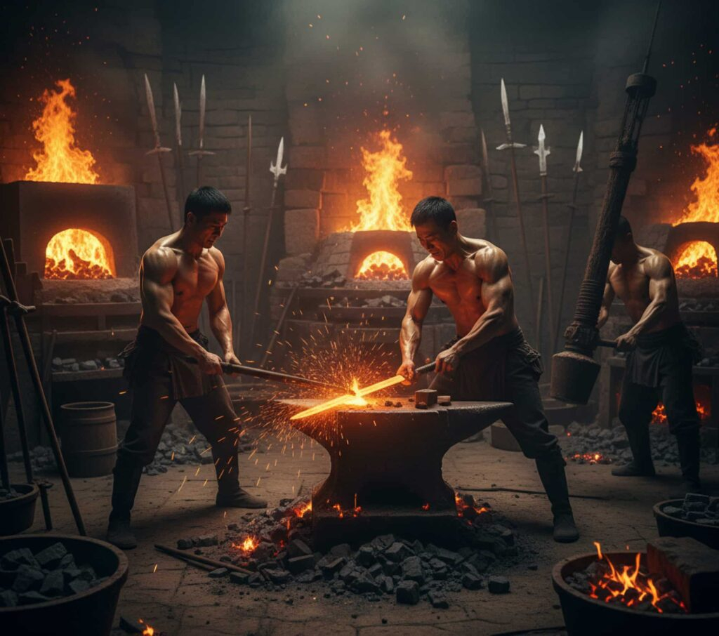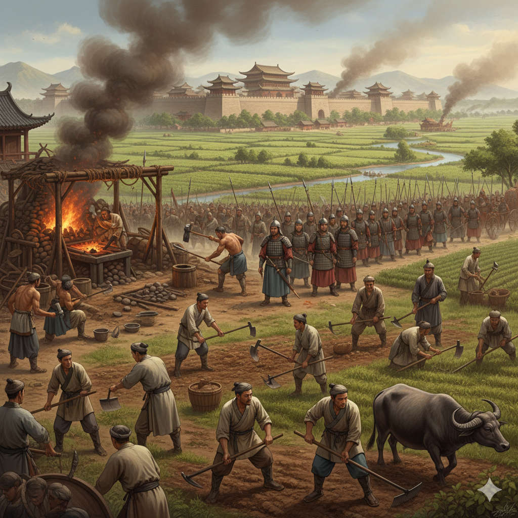 Forjadores en la antigua China trabajando en el taller de hierro, mientras los agricultores laboran en los campos y los soldados marchan hacia el horizonte. (Imagen generada con inteligencia artificial).
