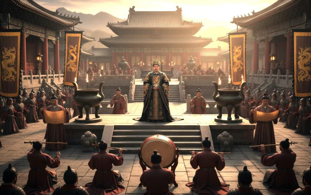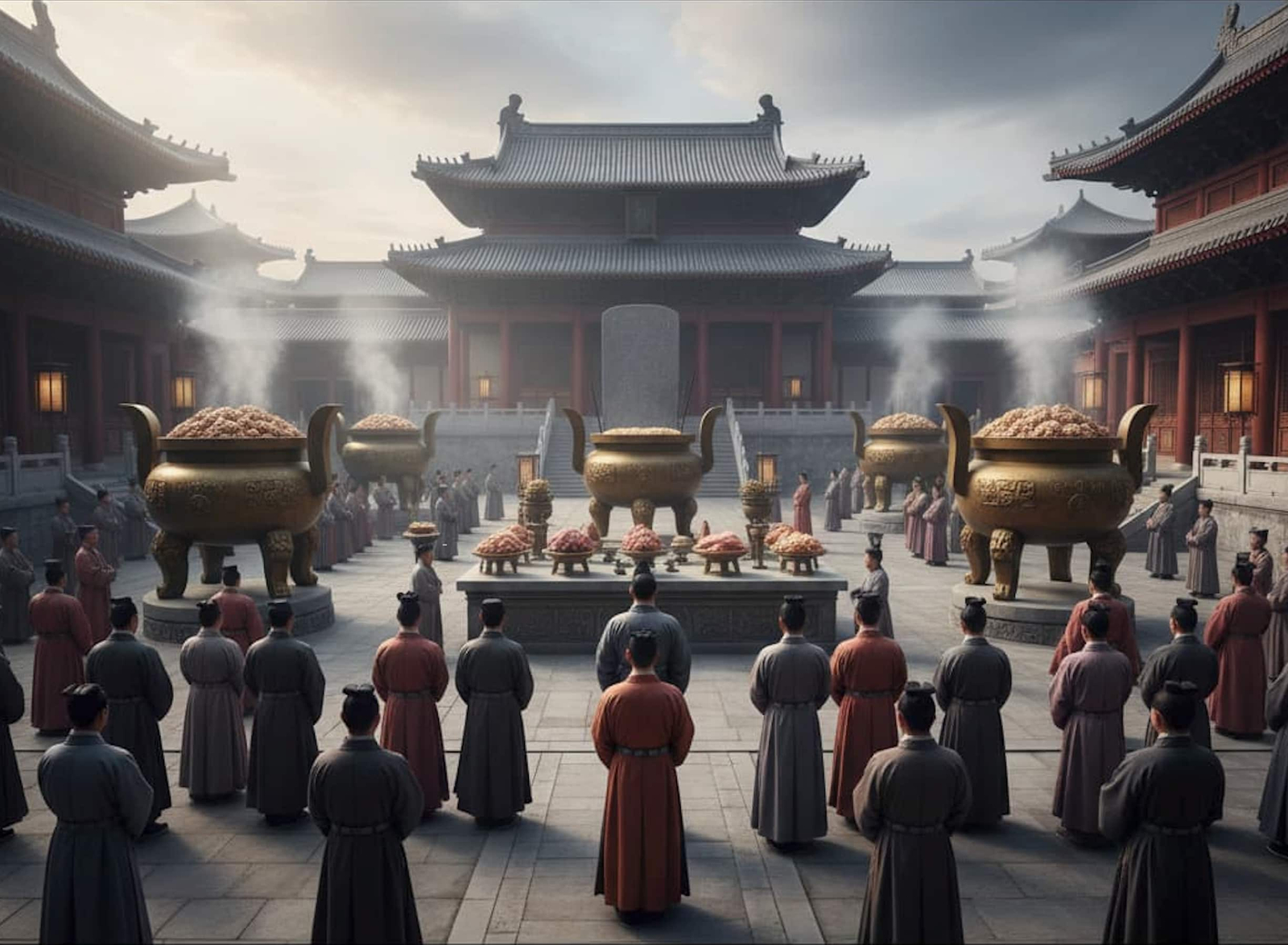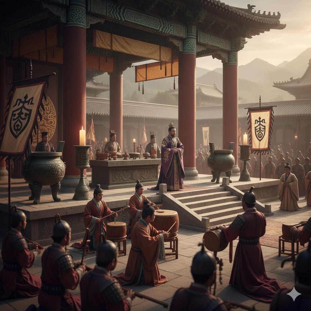 Escena ceremonial en la corte de la dinastía Zhou, con rituales de Estado, música y ofrendas como expresión del orden político y moral legitimado por el Mandato del Cielo. — Imagen generada con inteligencia artificial (Google Gemini).
