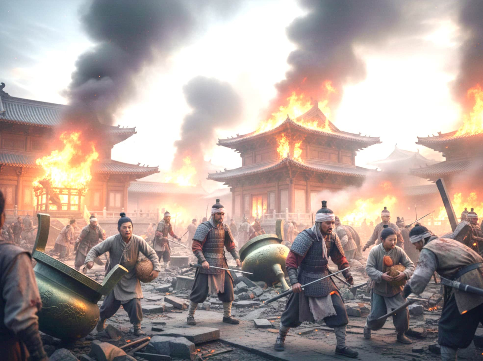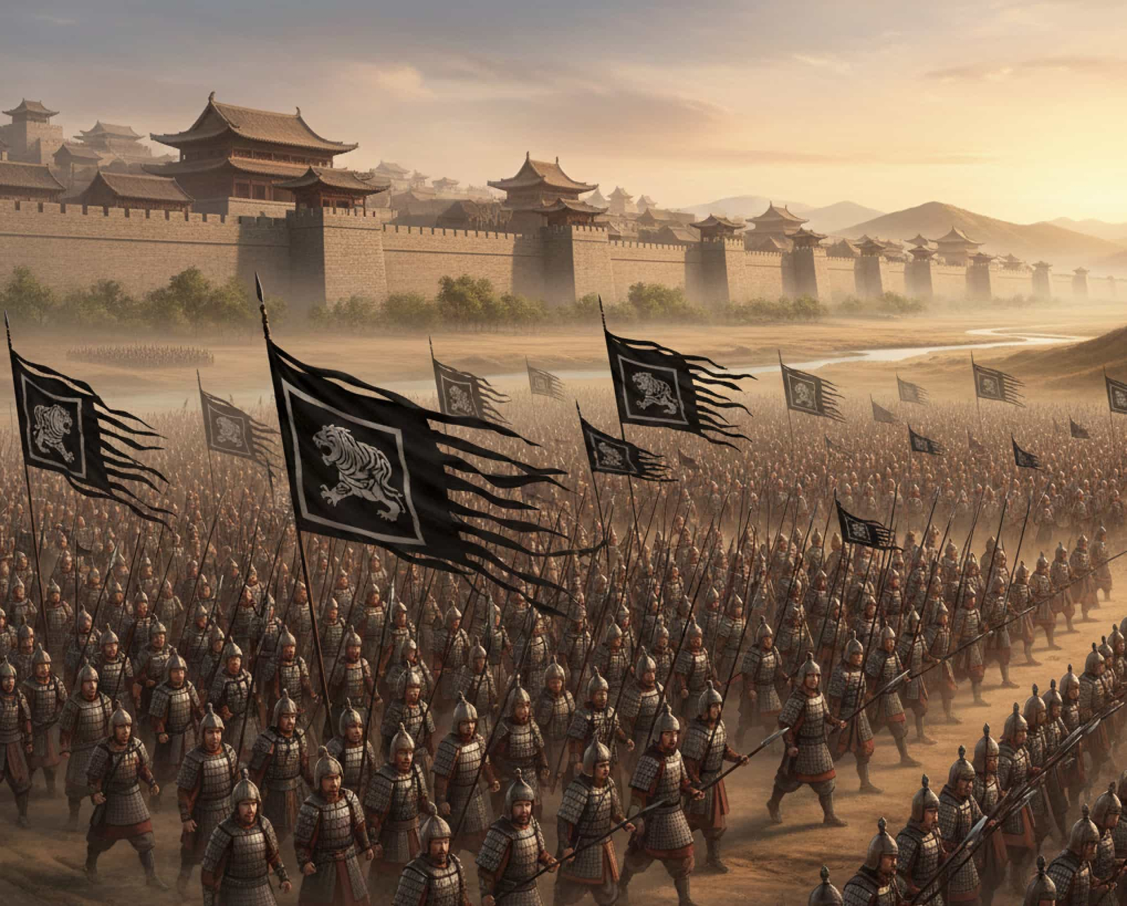 La imagen representa con gran fuerza visual el momento decisivo que pone fin a la China de los Zhou y da origen a una nueva etapa histórica: la unificación del territorio bajo el estado Qin. La inmensa masa de soldados avanzando en formación disciplinada, frente a una ciudad amurallada imponente, expresa el triunfo de un poder centralizado sobre el antiguo sistema feudal basado en linajes, rituales y lealtades fragmentadas.
