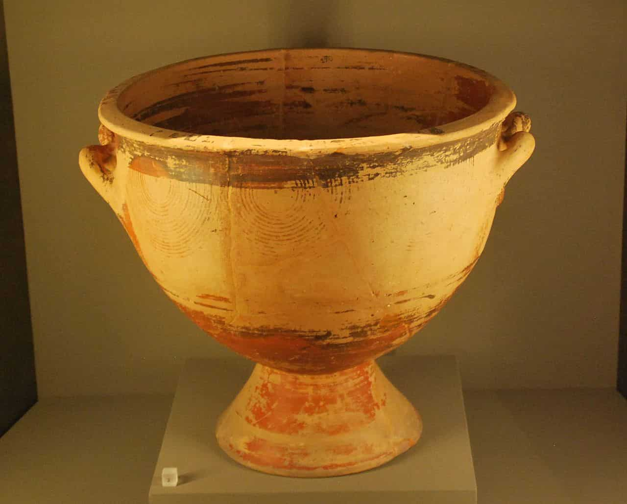 Crátera de pie alto con asas dobles. High footed krater with double handles (grave marker); 11th-10th century B.C. (Middle-Late Protogeometric); N.P Goulandris Coll. 290 in the Museum of Cycladic Art in Athens. Artist: Unknown; Picture: Marcus Cyron. CC BY-SA 3.0.