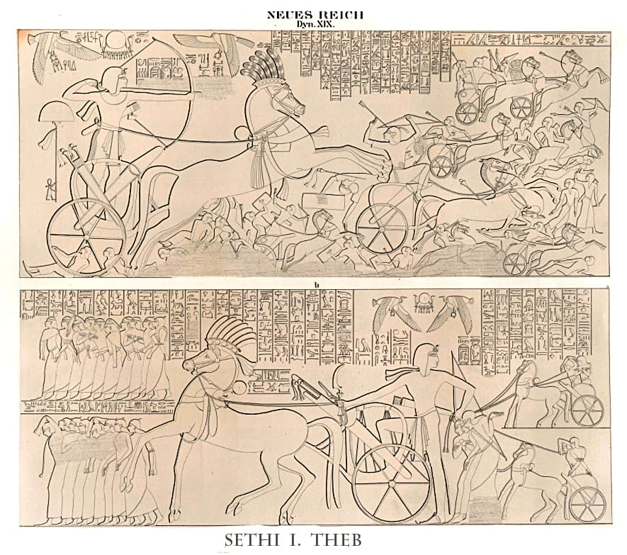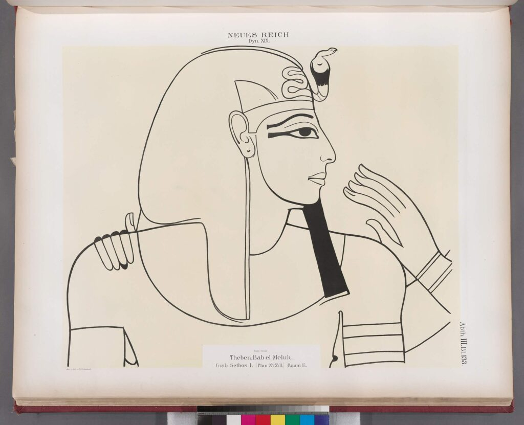 Perfil idealizado de un faraón del Imperio Nuevo, procedente de la tumba de Seti I (Dinastía XIX), Valle de los Reyes. Dibujo egiptológico del siglo XIX basado en relieves originales. Fuente: New York Public Library / Wikimedia Commons (dominio público).