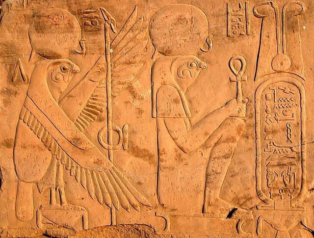 Horus y una divinidad solar en un relieve ritual — Relieve del Imperio Nuevo que representa a Horus, dios halcón y símbolo de la realeza, junto a una divinidad solar asociada, portadora del anj, emblema de la vida. La escena ilustra el lenguaje iconográfico del panteón egipcio y la relación entre culto, poder y orden cósmico. Fuente: Wikimedia Commons, dominio público. Foto: Dennis G. Jarvis. Original file (2,594 × 1,965 pixels, file size: 5.66 MB).