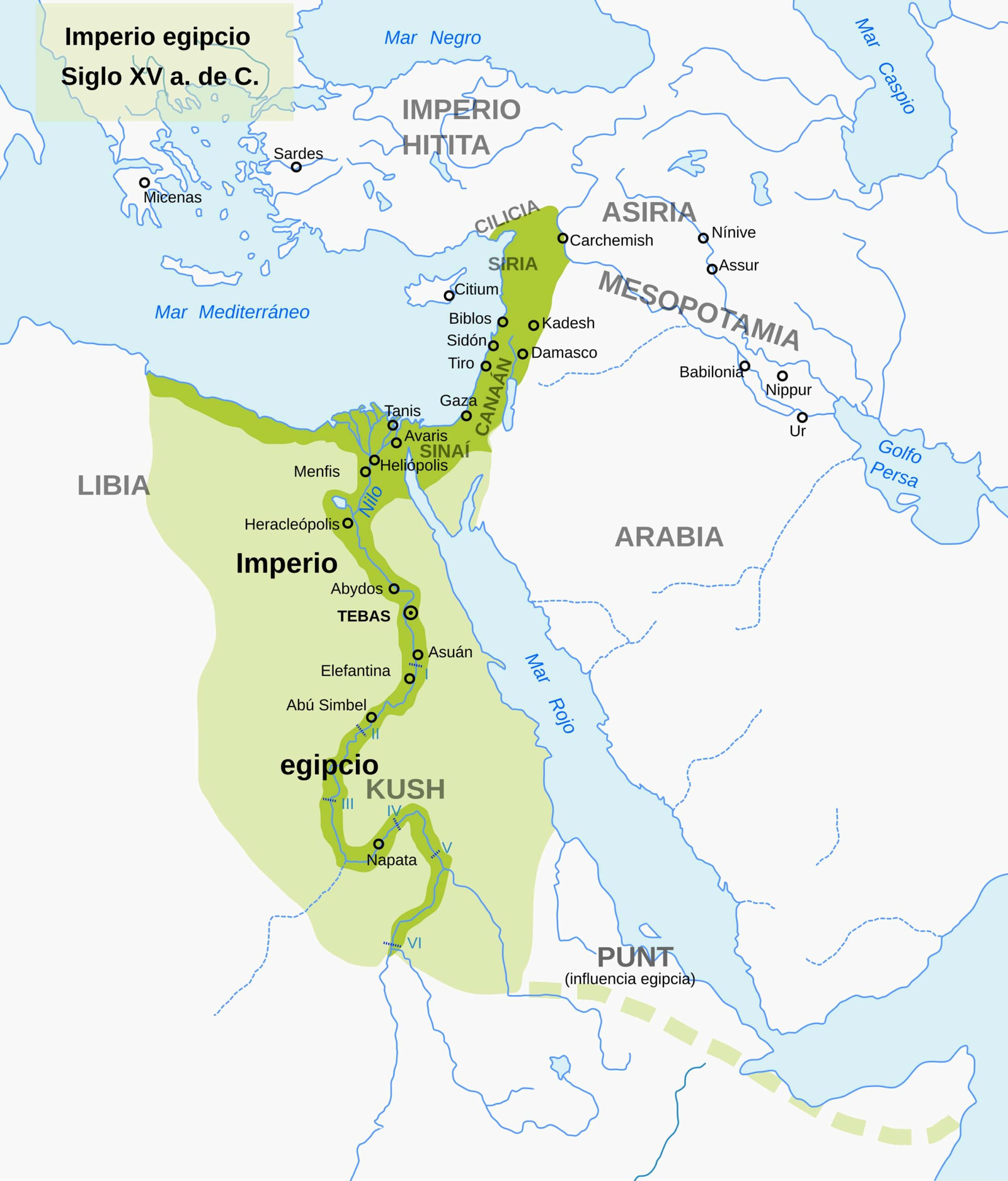 El Imperio Nuevo durante el siglo XV a. C. Fuente: Wikimedia Commons. Obra derivada a partir de trabajos de ArdadN y Jeff Dahl. Licencia CC BY-SA.