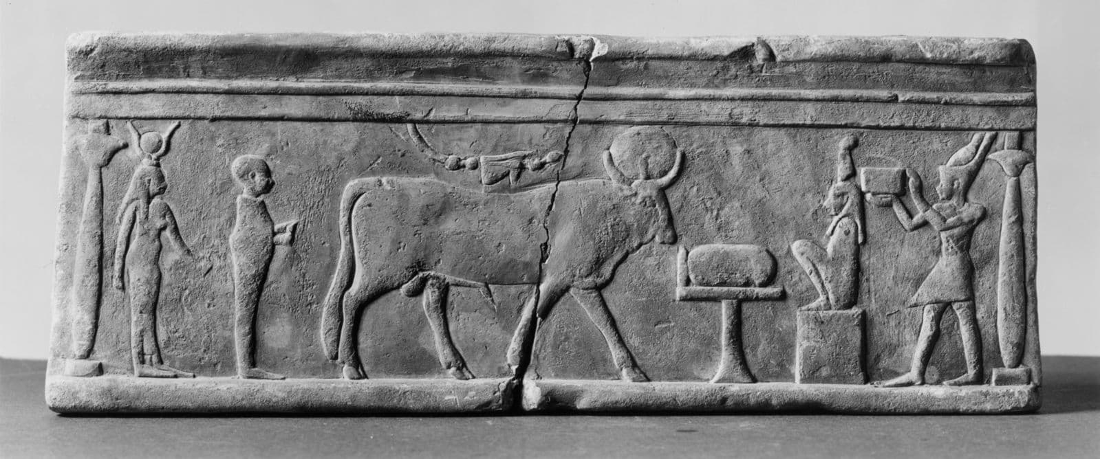 Escena ritual templaria vinculada al orden divino — Relieve egipcio que muestra una secuencia ritual ordenada ante una divinidad o animal sagrado. Ejemplo de cómo el principio de maat se expresa a través del culto, la jerarquía y la correcta ejecución de los rituales. Fuente: Wikimedia Commons, dominio público, Walters Art Museum.