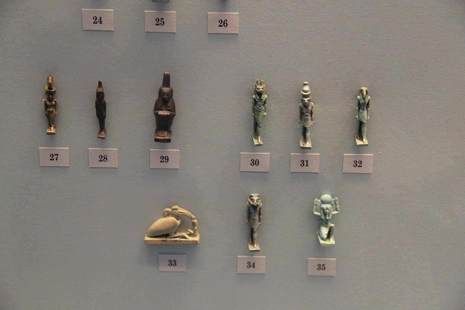 Entre los amuletos más comunes se encontraban el ojo udjat (ojo de Horus), símbolo de integridad y curación; el anj, asociado a la vida; el escarabajo, vinculado a la regeneración; y figuras de divinidades protectoras como Bes y Taweret, especialmente relacionadas con el embarazo, el parto y la infancia. Estas divinidades, de aspecto poco solemne y cercano, encarnaban una religiosidad más íntima y accesible, alejada del hieratismo del culto estatal.