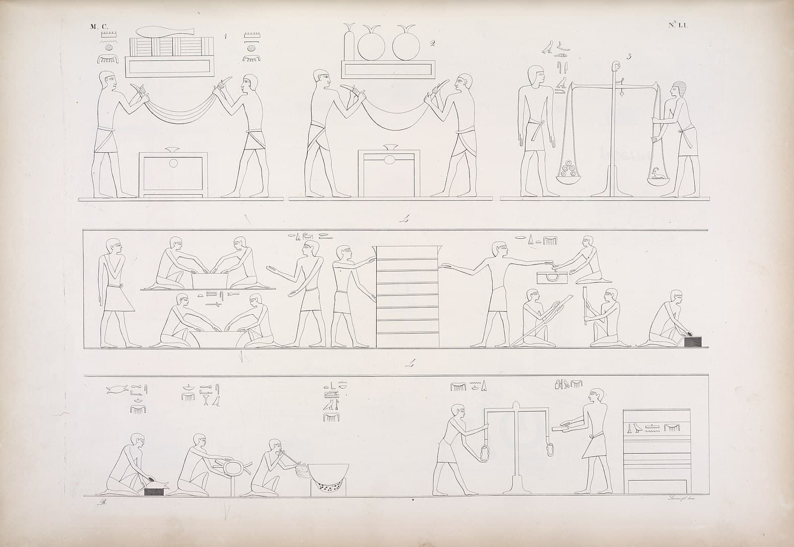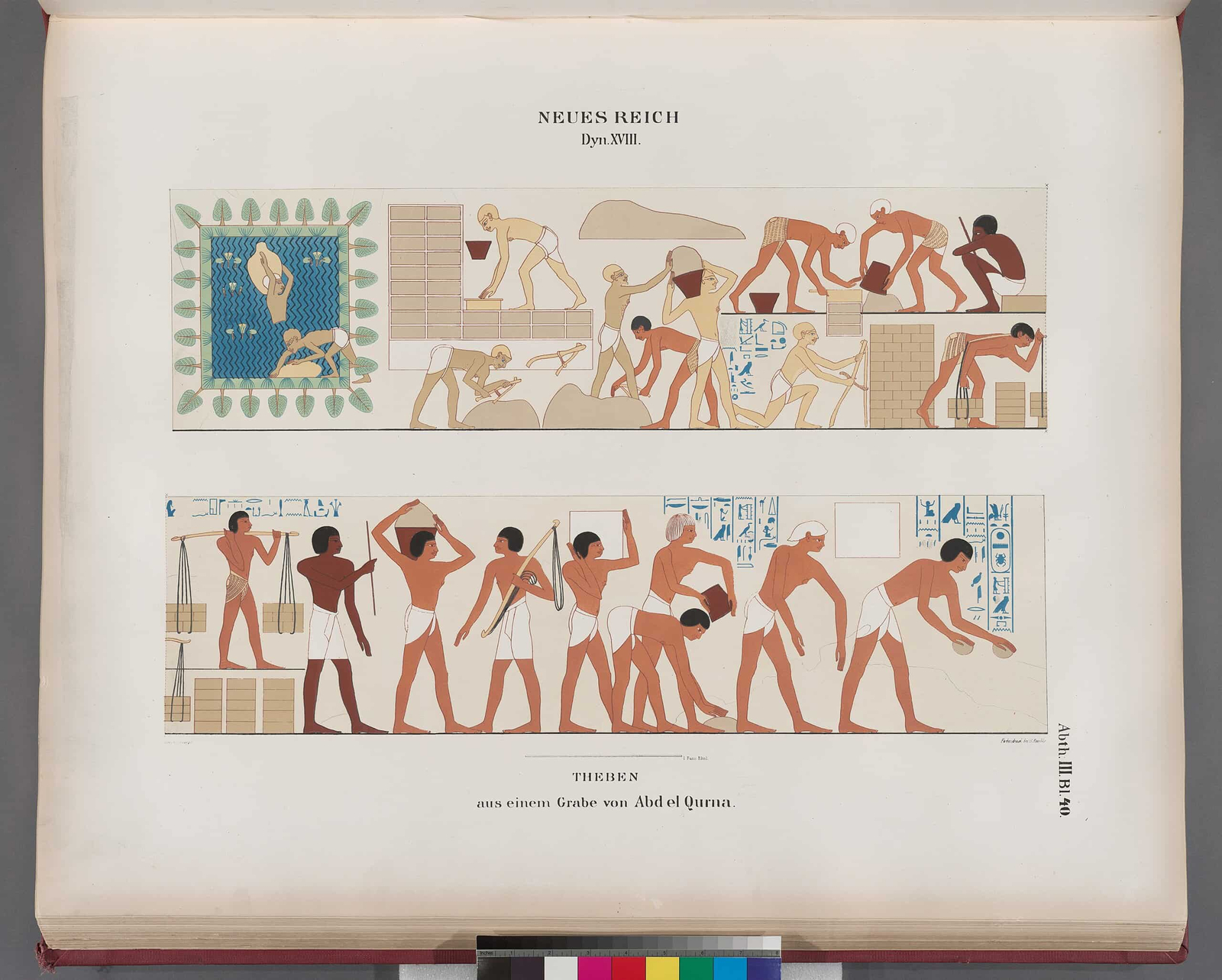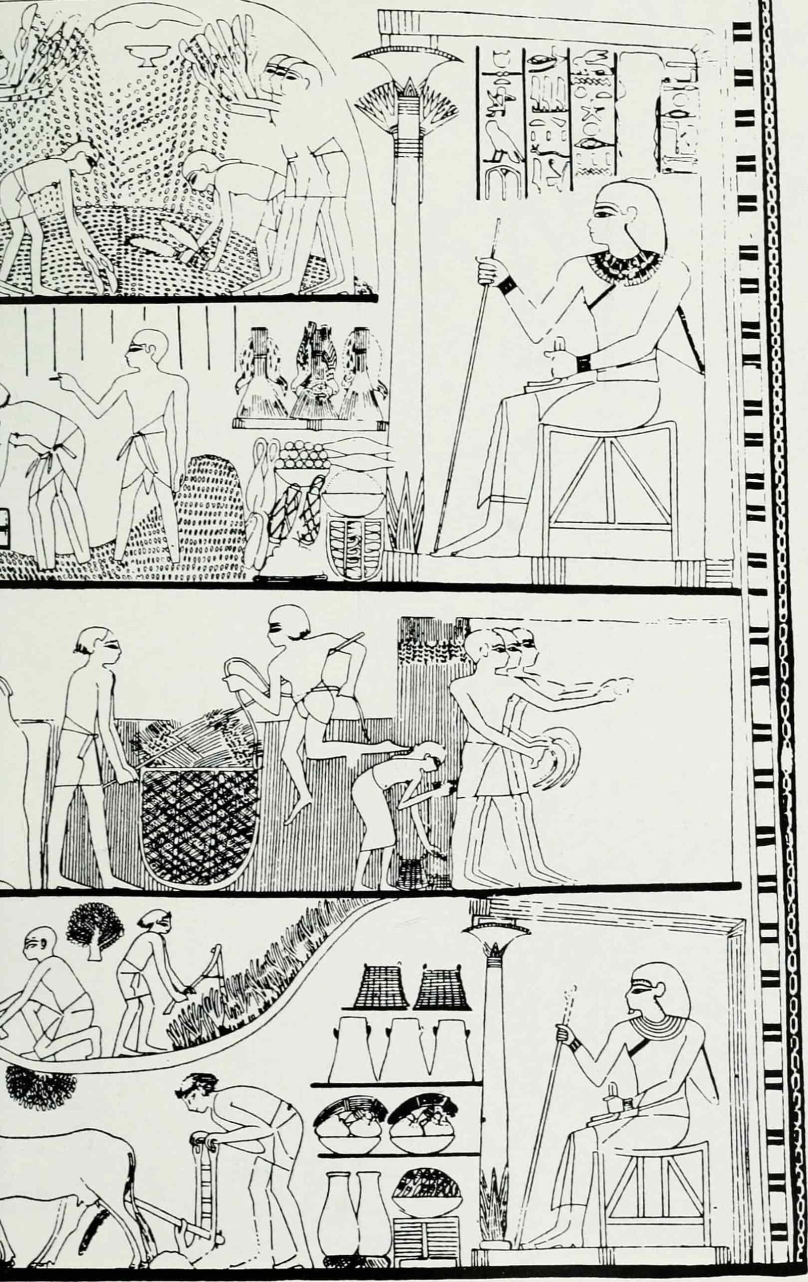 Escenas de trabajo, producción y transporte en el Imperio Nuevo. Relieves procedentes de una tumba de funcionarios en Tebas (dinastía XVIII), que muestran actividades agrícolas, artesanales y logísticas bajo la administración estatal. Ilustración egiptológica del siglo XIX basada en relieves originales. Fuente: Wikimedia Commons / dominio público. Scan by NYPL. Original file (6,299 × 5,048 pixels, file size: 4.78 MB).