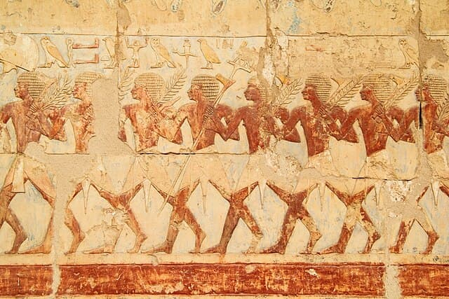 El reinado de Hatshepsut se caracterizó por una política exterior basada más en el comercio y la prosperidad que en la conquista. La célebre expedición al país de Punt, representada en los relieves de Deir el-Bahari, simboliza esta orientación: intercambio de bienes exóticos, incienso, maderas preciosas y animales, presentados como dones divinos que enriquecen Egipto y confirman el favor de los dioses.