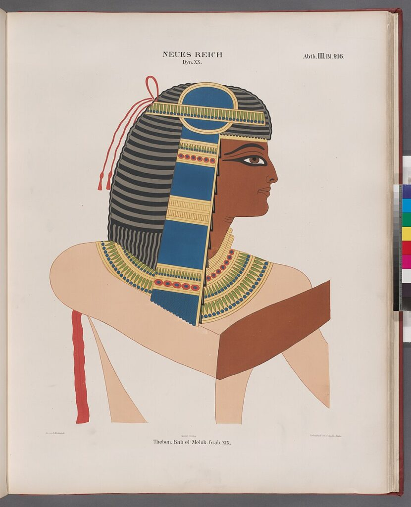 Figura masculina egipcia según el canon artístico del Imperio Nuevo — Lámina decimonónica basada en relieves de una tumba del Valle de los Reyes (dinastía XX). Representación idealizada de la identidad egipcia a través del perfil, la vestimenta y la ornamentación. Fuente: Wikimedia Commons / New York Public Library, dominio público. Original file (5,104 × 6,299 pixels, file size: 4.79 MB).