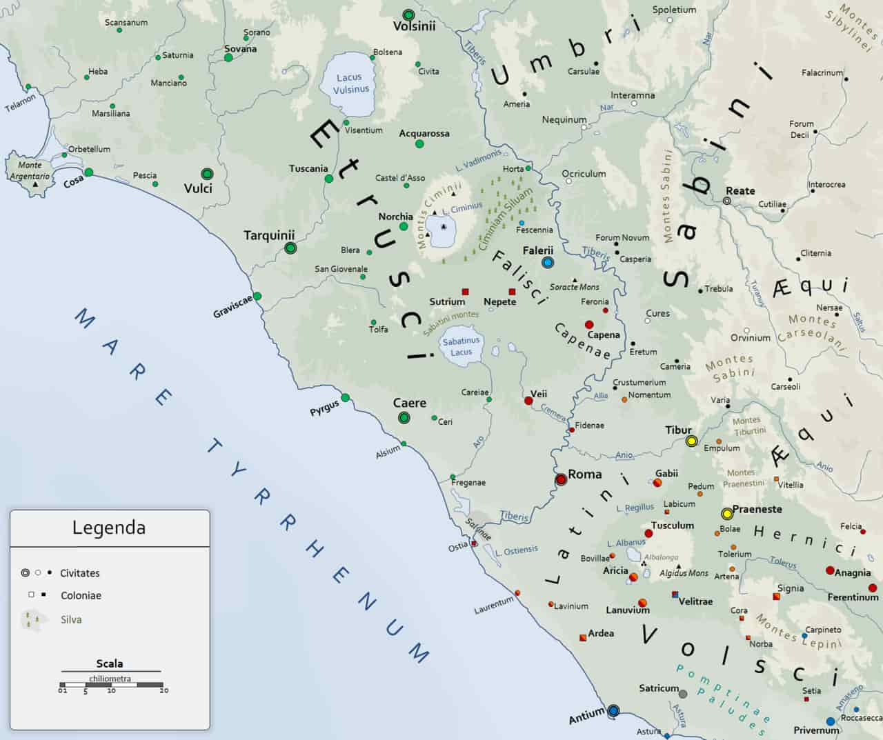 Según el mito de la fundación de Roma que explica Tito Livio, los etruscos, liderados por Mecencio y aliados con el rey Turno de los rútulos, atacaron a los latinos y a los troyanos exiliados, que estaban liderados por Latino y Eneas, respectivamente. Los latinos y los troyanos resultaron vencedores, y Turno murió en combate. La paz consiguiente estableció las bases según las cuales el río Tíber sería la frontera común entre los etruscos y los latinos.