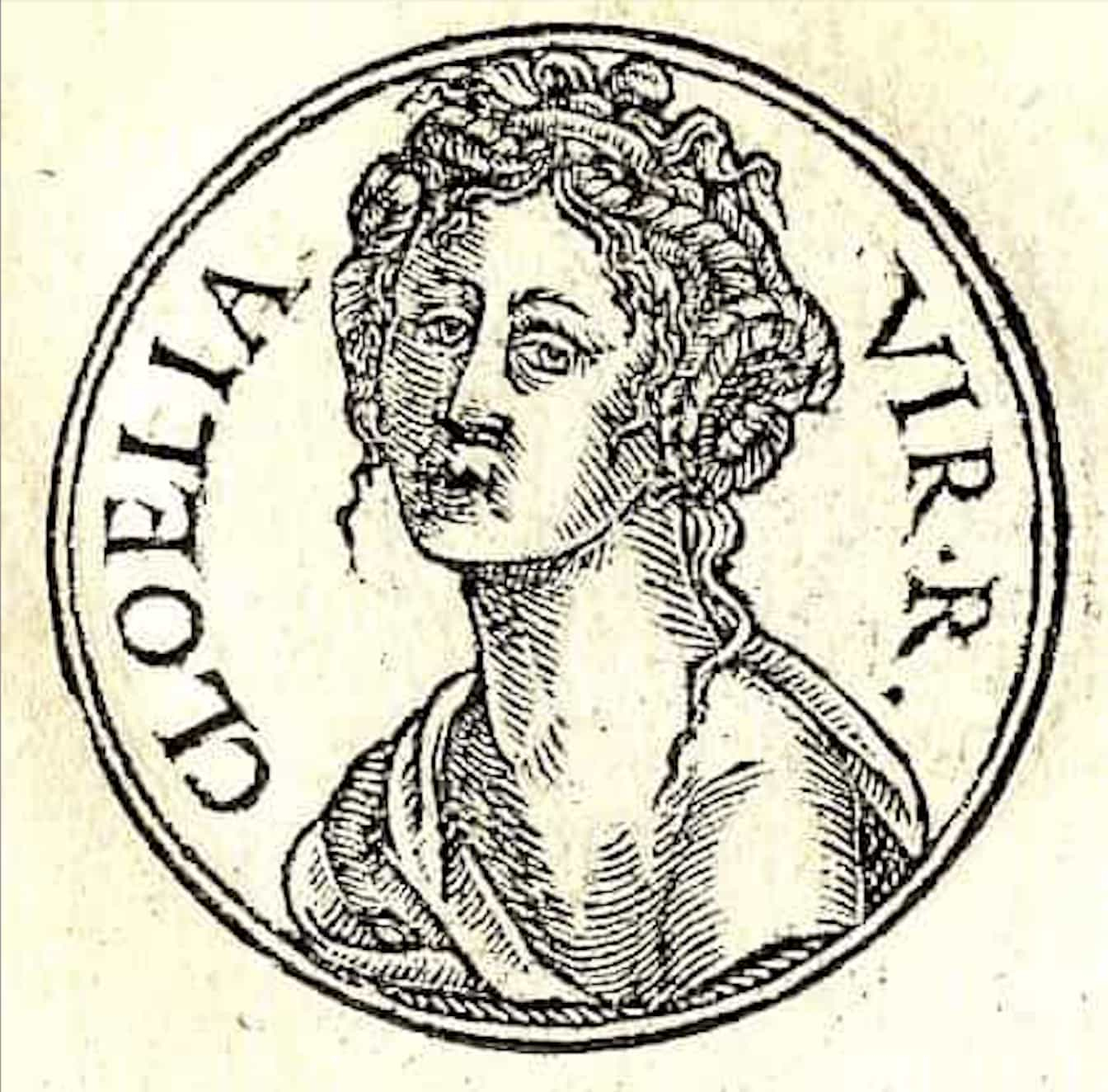 Representación del siglo XVI de Clelia. Published by Guillaume Rouille (1518?-1589) – «Promptuarii Iconum Insigniorum». Cloelia is a figure from the early history of the city of Rome. Dominio Público.