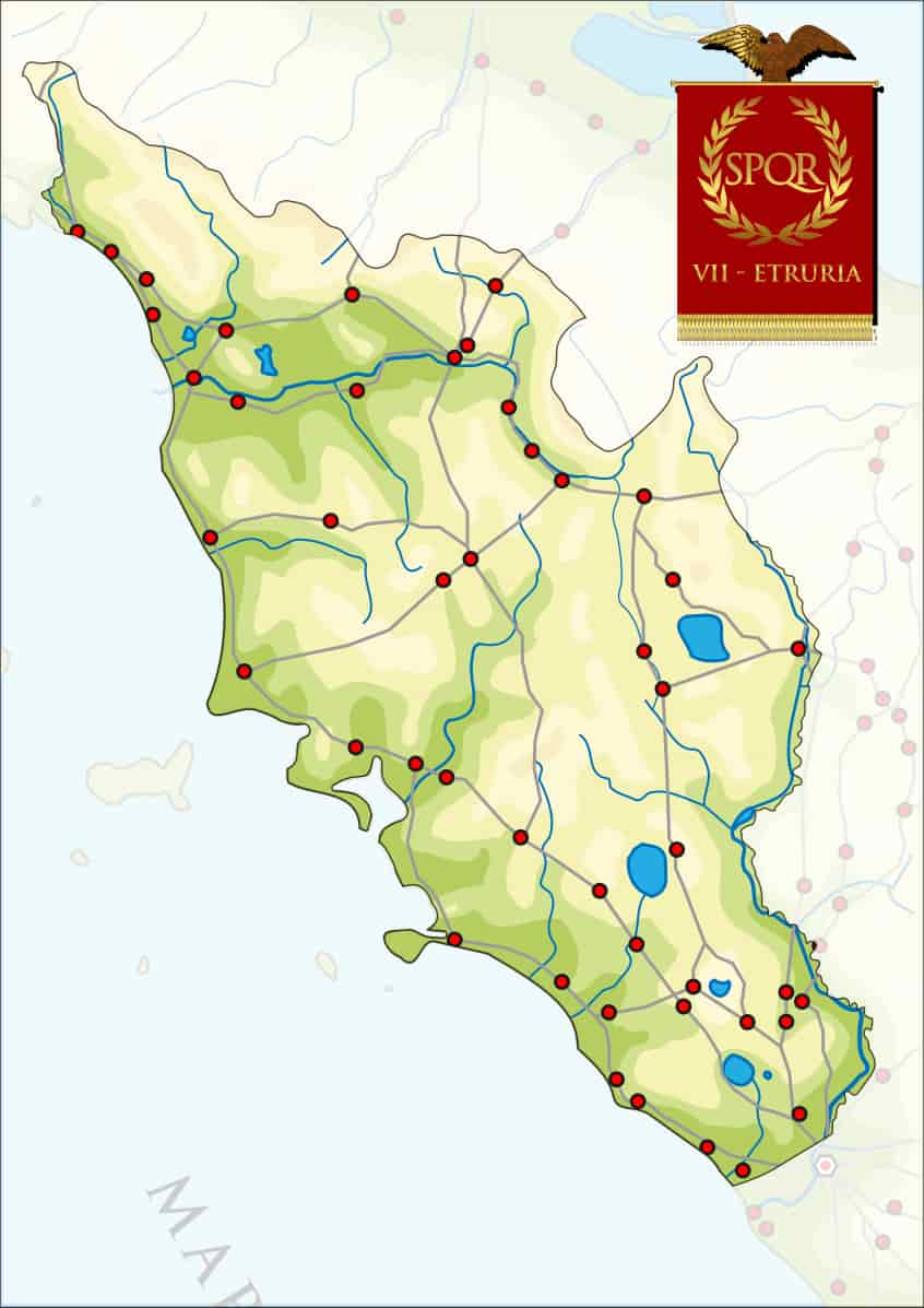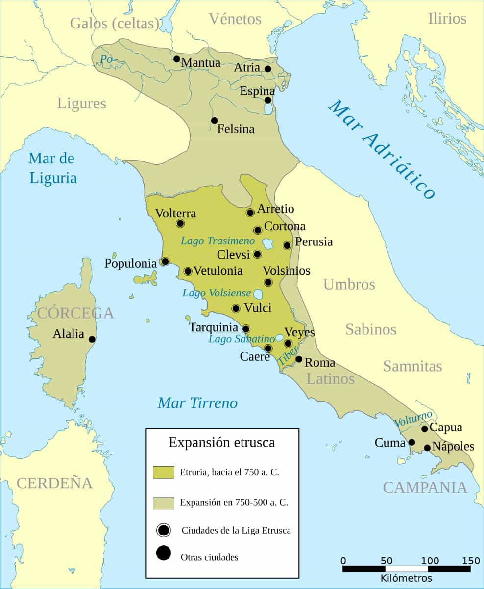 Los etruscos se instalaron inicialmente en el territorio llamado Etruria, triángulo comprendido entre el Arno al norte, el Tíber al sur y el mar Tirreno al oeste.
