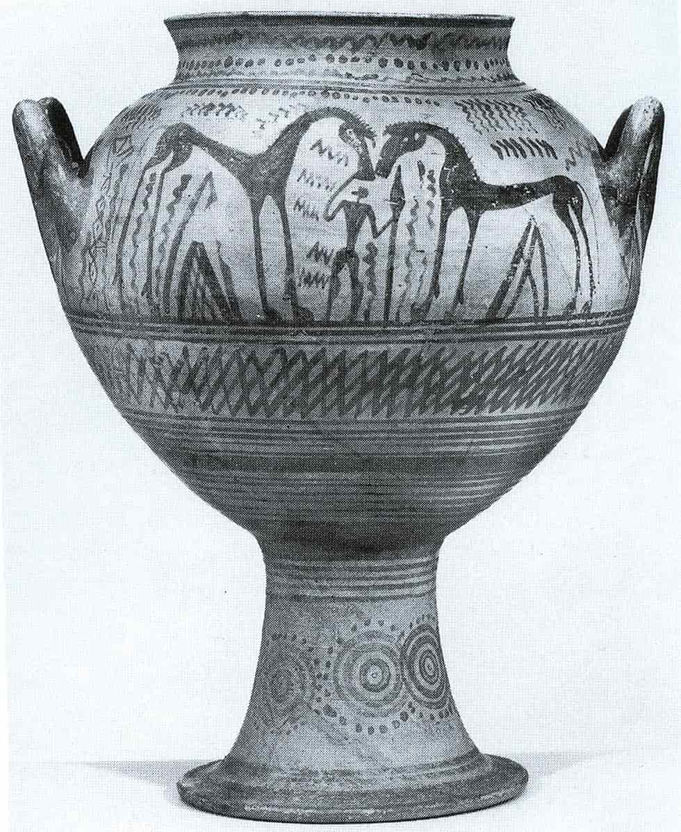 - 700-630 a. C.: período «oriental» u «orientalizante». Debido a los intercambios culturales entre las civilizaciones mediterráneas en esta época, especialmente con la Grecia Antigua, apareció en el arte etrusco una tradición figurativa que se basaba en modelos griegos.