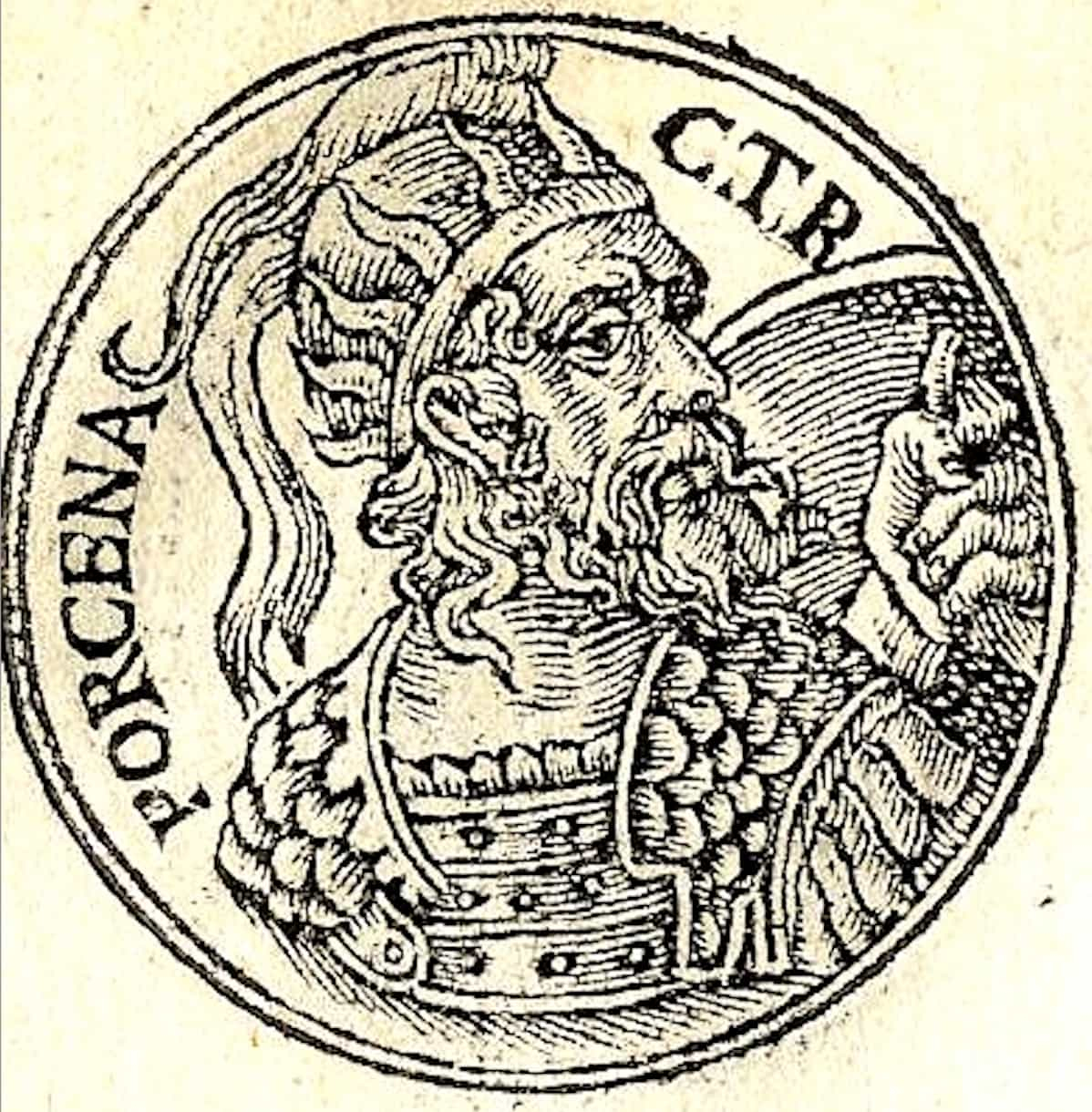 Lars Porsena fue un rey Etrusco conocido por su oposición y guerra contra la ciudad de Roma. Published by Guillaume Rouille (1518?-1589) – «Promptuarii Iconum Insigniorum». Dominio público.