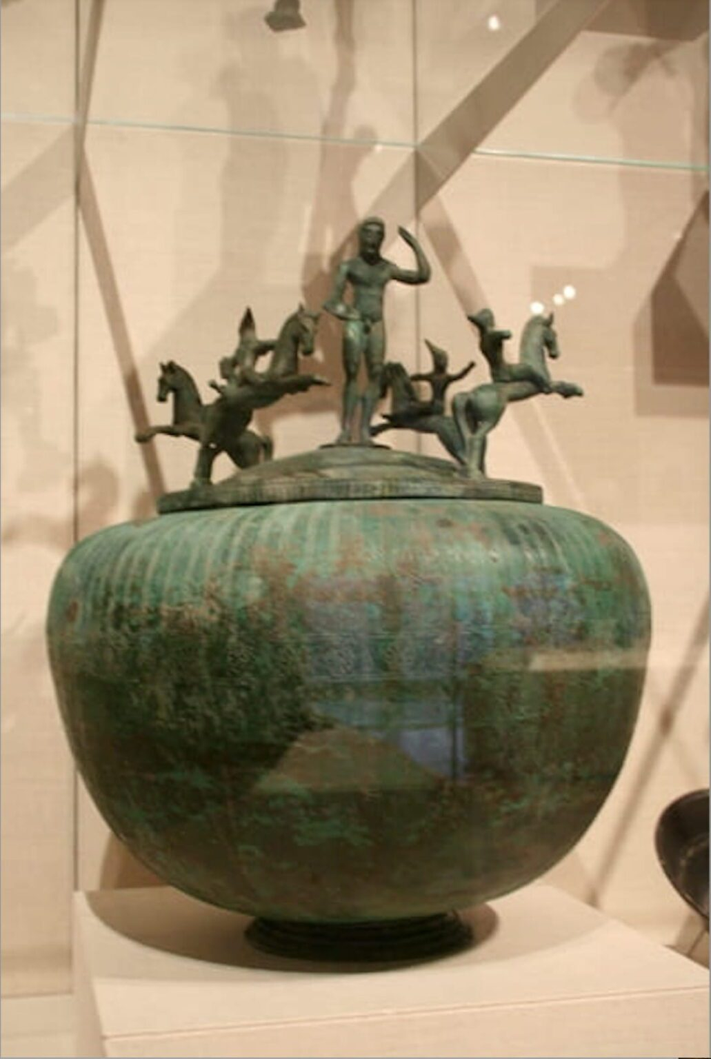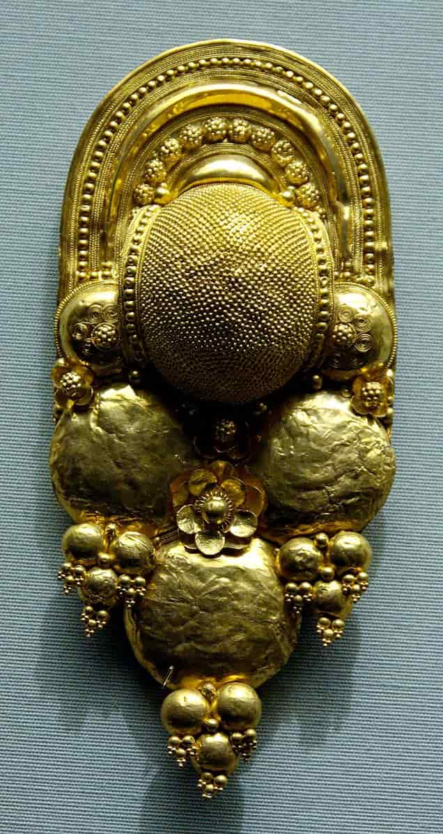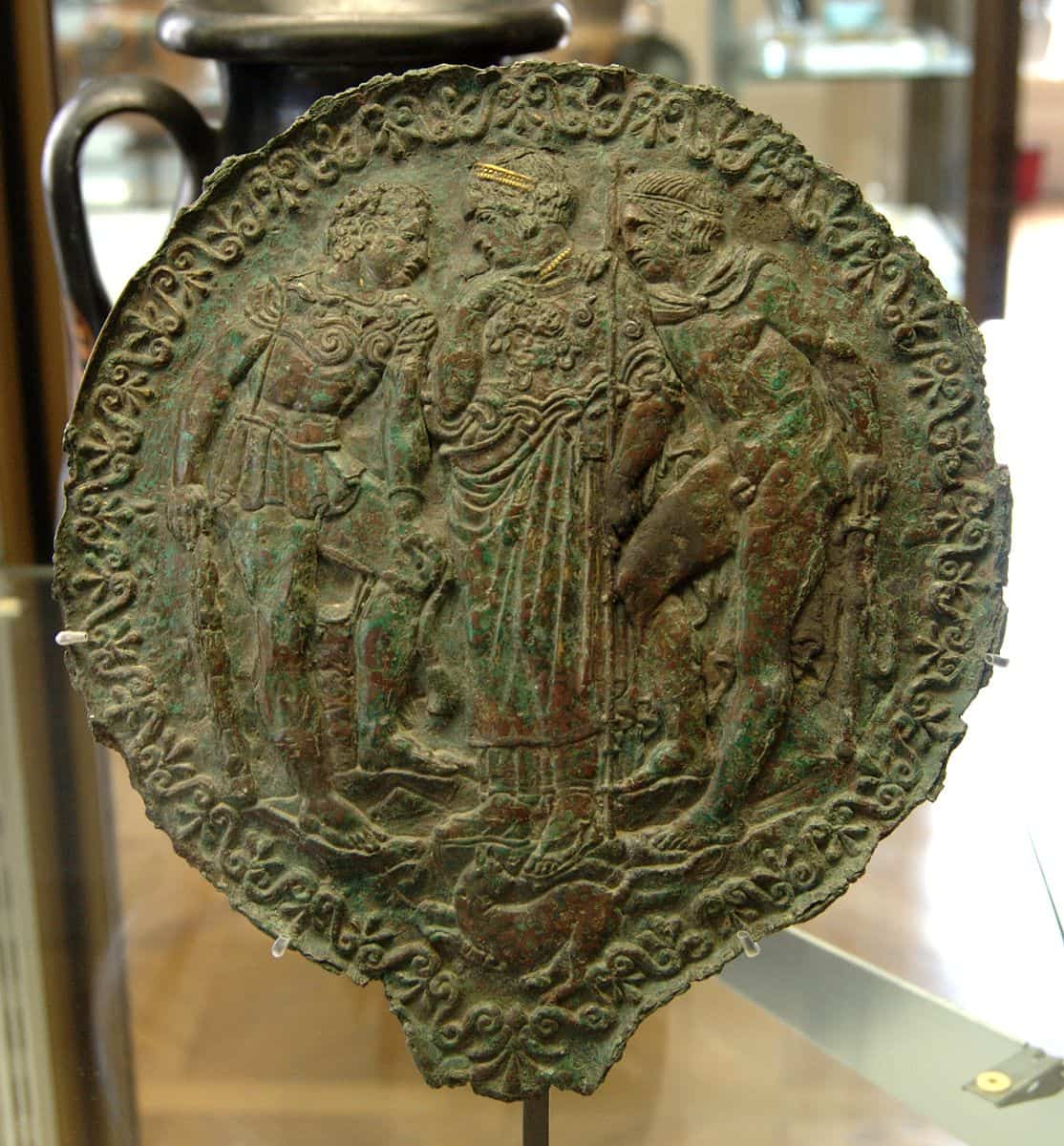 Dos jinetes etruscos y un hombre caído (540 a. C. – 520 a. C.), panel de plata encontrado en 1812 en una tumba en Castel San Marino, cerca de Perugia. Marie-Lan Nguyen y un autor más. Dominio público. Original file (2,050 × 1,860 pixels, file size: 2.99 MB).
