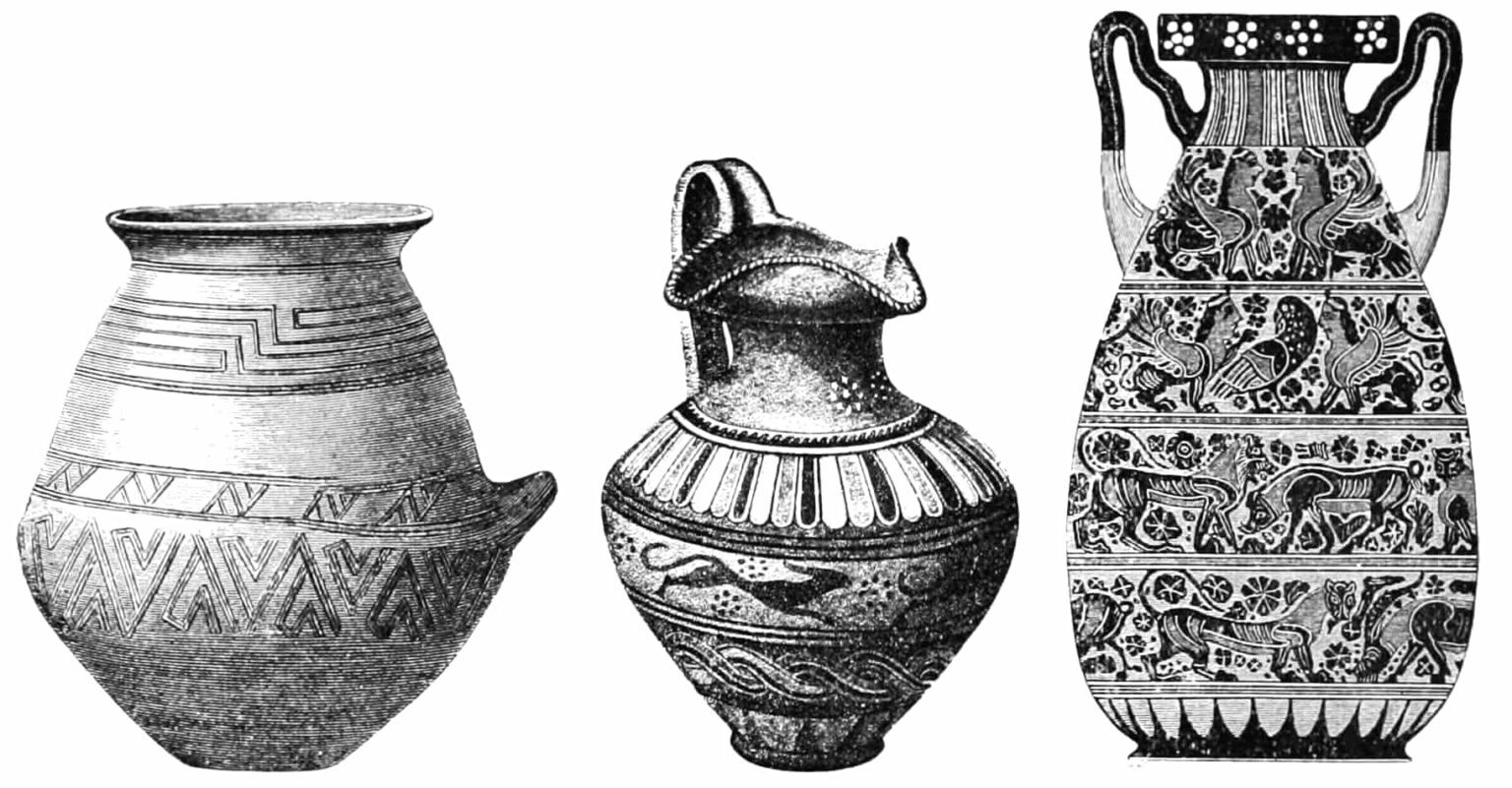 - 630-500 a. C.: Período arcaico. Influencias jónicas y corintias. Debido a mayores intercambios y a la estructuración de la sociedad etrusca, emergieron nuevas técnicas artísticas. En particular, la pintura conoció un desarrollo espectacular: de la decoración de las techumbres se pasa a pintar jarros y frescos; se difunde la escultura en terracota pintada.