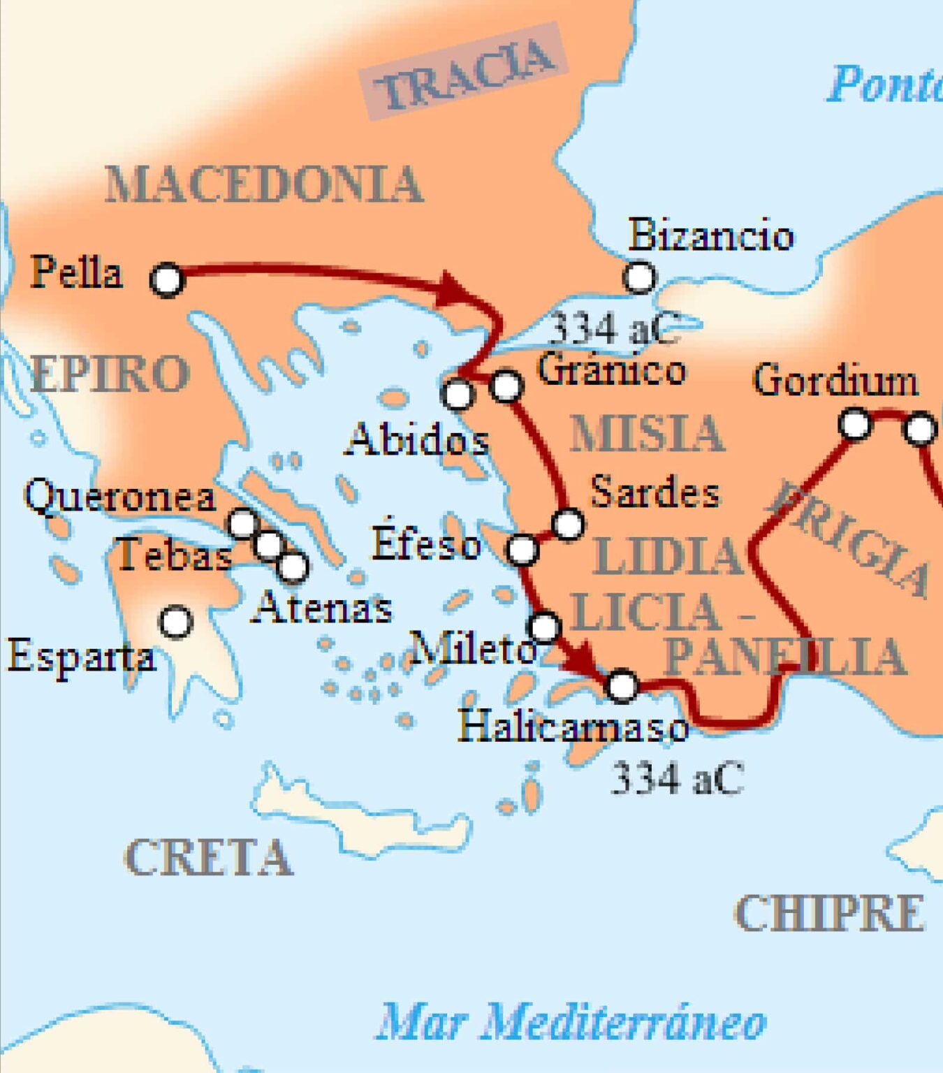 Tras consolidar la frontera de los Balcanes y la hegemonía macedonia sobre las ciudades-estado de la antigua Grecia, poniendo fin a la rebelión que se produjo tras la muerte de su padre, Alejandro cruzó el estrecho del Helesponto hacia Asia Menor (334 a. C.) y comenzó la conquista del Imperio persa, regido por Darío III. Victorioso en las batallas del Gránico (334 a. C.), Issos (333 a. C.), Gaugamela (331 a. C.) y de la Puerta Persa (330 a. C.), se hizo con un dominio que se extendía por la Hélade, Egipto, Anatolia, Oriente Próximo y Asia Central, hasta los ríos Indo y Oxus. Habiendo avanzado hasta la India, donde derrotó al rey Poro en la batalla del Hidaspes (326 a. C.), sus tropas se negaron a continuar hacia Oriente y hubo de regresar a Babilonia, donde falleció sin completar sus planes de conquista de la península arábiga. Con la llamada «política de fusión», Alejandro promovió la integración de los pueblos sometidos a la dominación macedonia promoviendo su incorporación al ejército y favoreciendo los matrimonios mixtos entre las élites macedonia y persa. Él mismo se casó con dos mujeres persas de noble cuna.