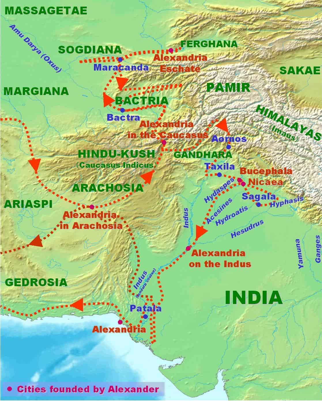 En sus treinta y dos años de vida, su Imperio se extendió desde Grecia, hasta el valle del Indo por el Este y hasta Egipto por el Oeste, donde fundó la ciudad de Alejandría (5) (hoy Al-ʼIskandariya, الاسكندرية). Fundador prolífico de ciudades, esta ciudad egipcia habría de ser con mucho la más famosa de todas las Alejandrías fundadas por el también faraón Alejandro. De las setenta ciudades que fundó, cincuenta de ellas llevaban su nombre.