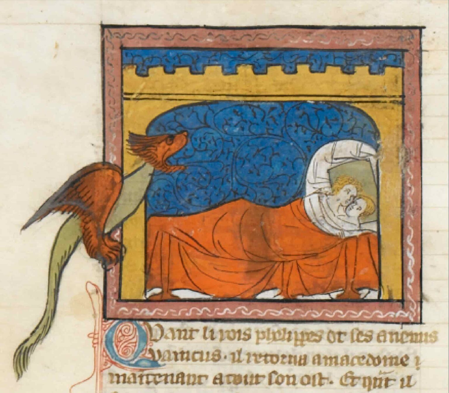 Las fuentes también recogen sueños y señales divinas relacionados con su concepción. Olimpia habría soñado que un rayo caía sobre su vientre, prendía fuego sin dañarla y se expandía por todo el mundo. Filipo, por su parte, soñó que el abdomen de su esposa estaba sellado con el rostro de un león. Ambos sueños fueron interpretados por adivinos como señales de que el hijo por nacer tendría una naturaleza excepcional. No obstante, también surgieron rumores de carácter más inquietante. Según algunos relatos, Filipo interpretó el sueño de su esposa como un indicio de infidelidad, lo que daría origen a leyendas que cuestionaban su paternidad.